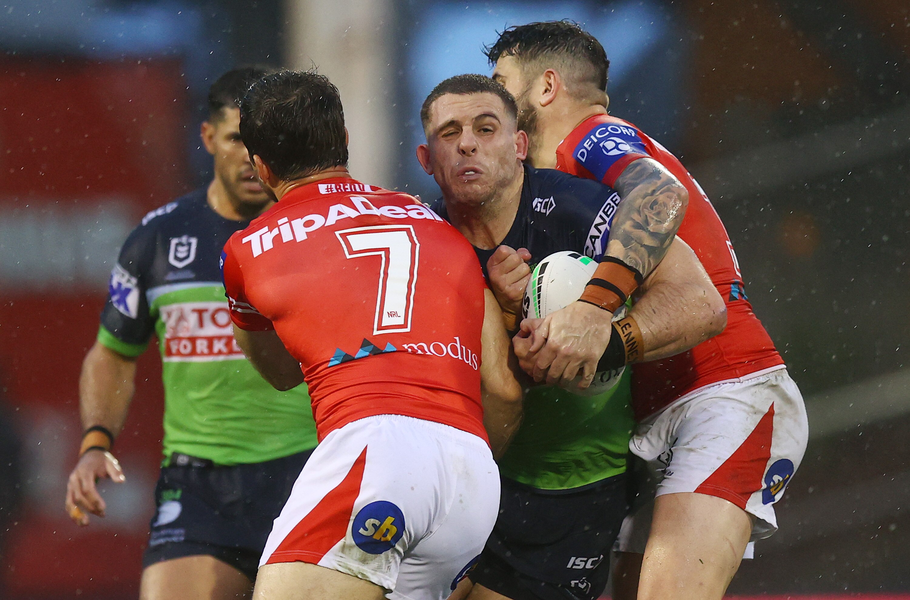 In Saturday's second match, St George Illawarra held off Canberra amid much drama at full-time to win 12-10 in wet conditions in Wollongong.