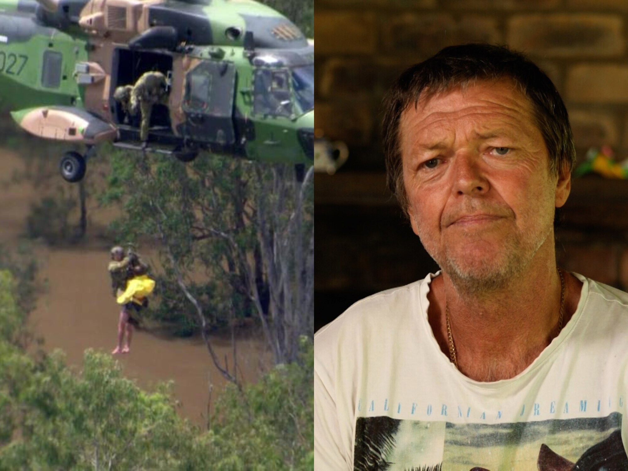 In footage that captured the nation's attention, his bare legs dangled above metres of churning floodwater as soldiers rescued him by helicopter.