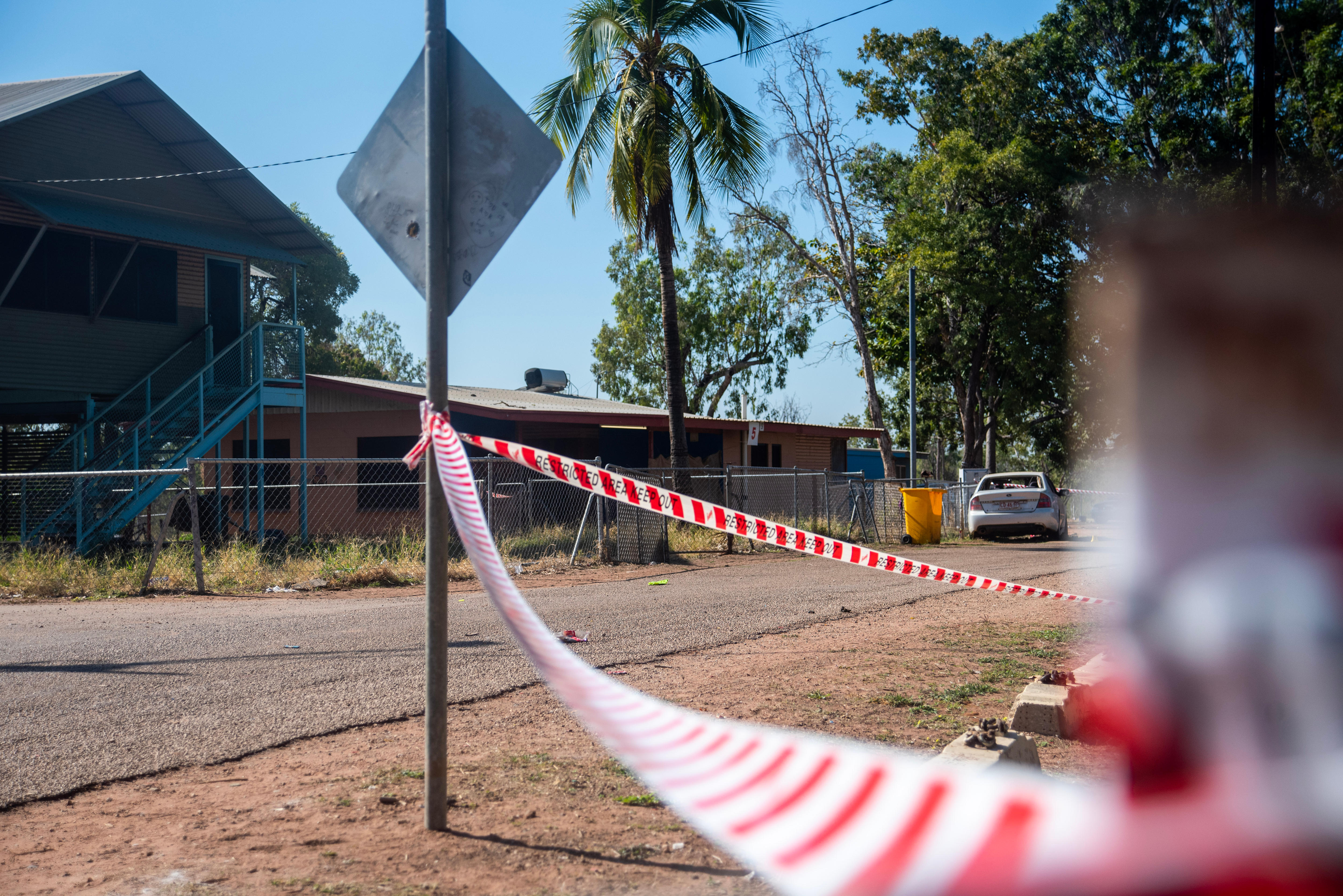 A large crime scene has been established by NT Police around a number of homes in the community, which is also blocking one road.