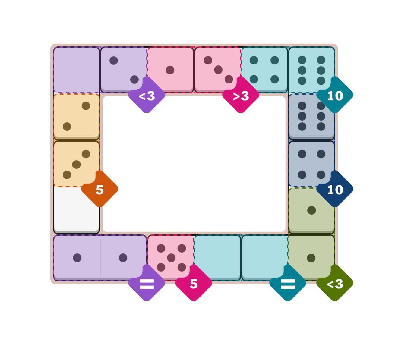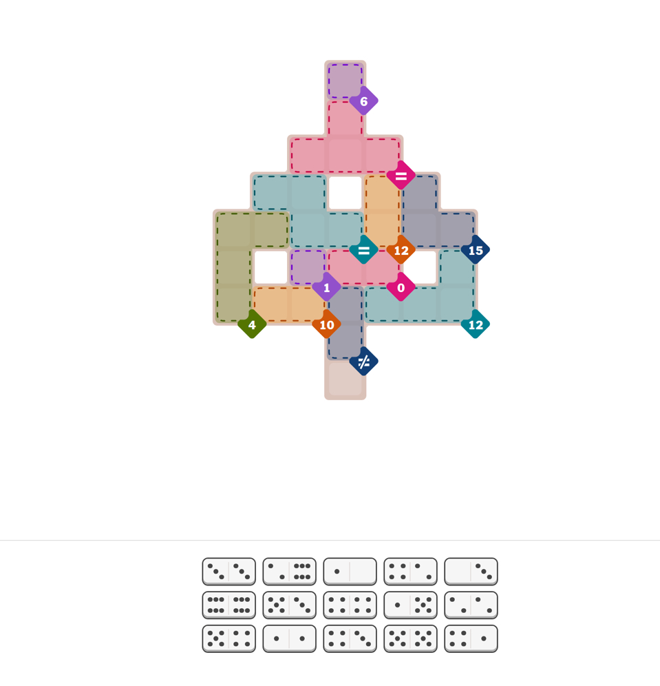 You select dominoes and place dominoes into the grid to meet those conditions. You must use every domino to achieve each condition and win the game. Clicking or tapping on the dominoes rotates them so you can position the tiles.