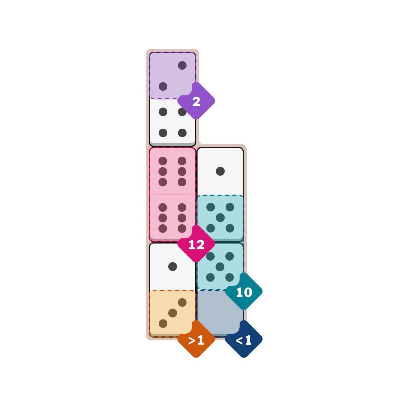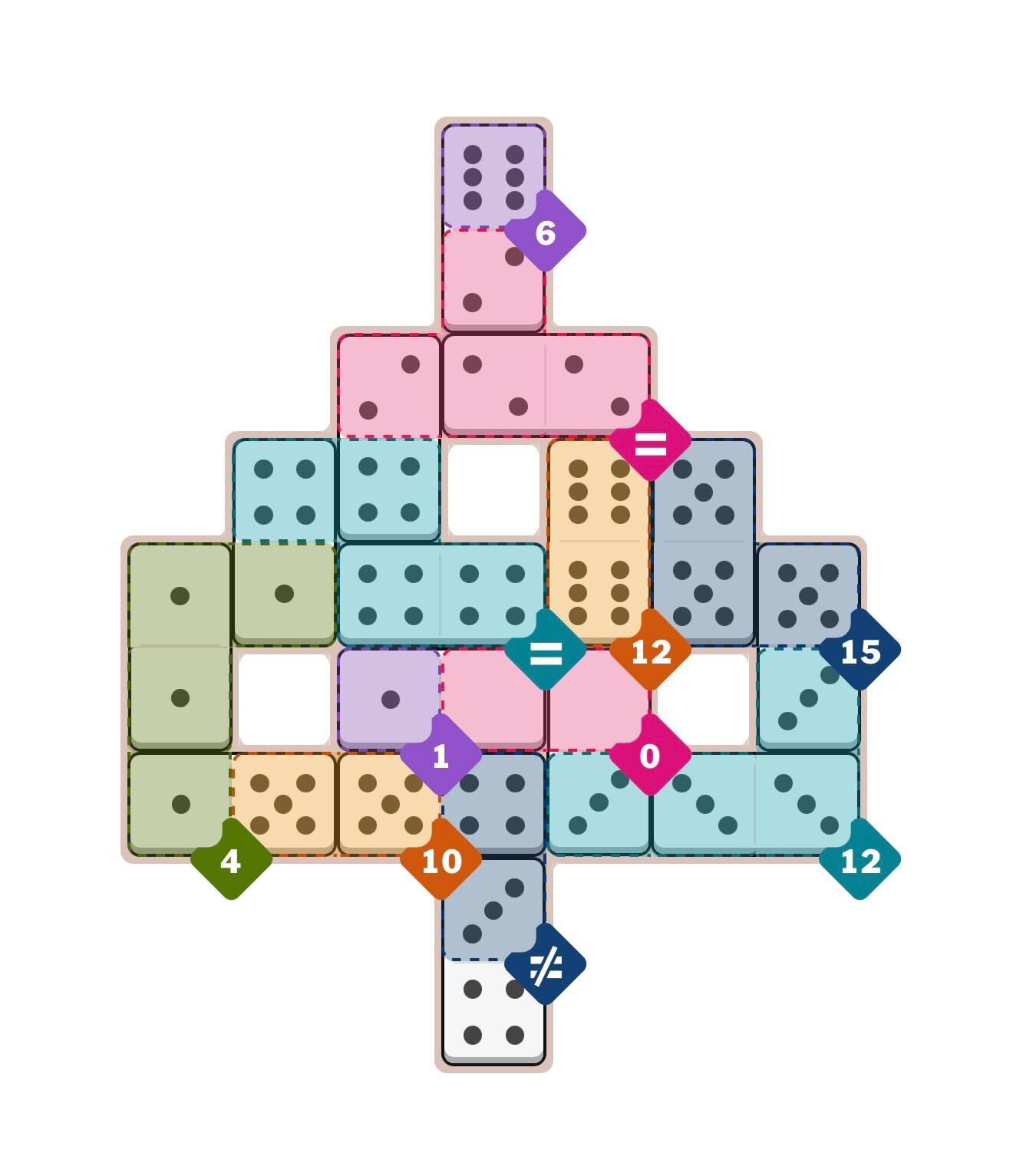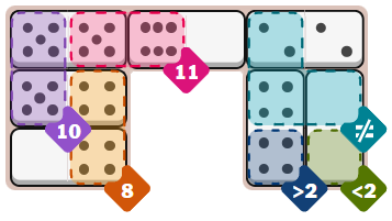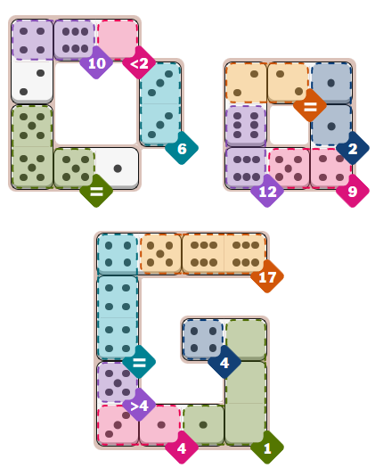 In the above example from a medium puzzle, there are four colored zones. Your placed dominoes must total 12 in the purple zone. In the teal and orange sectors, the number of domino pips must be greater than 3.