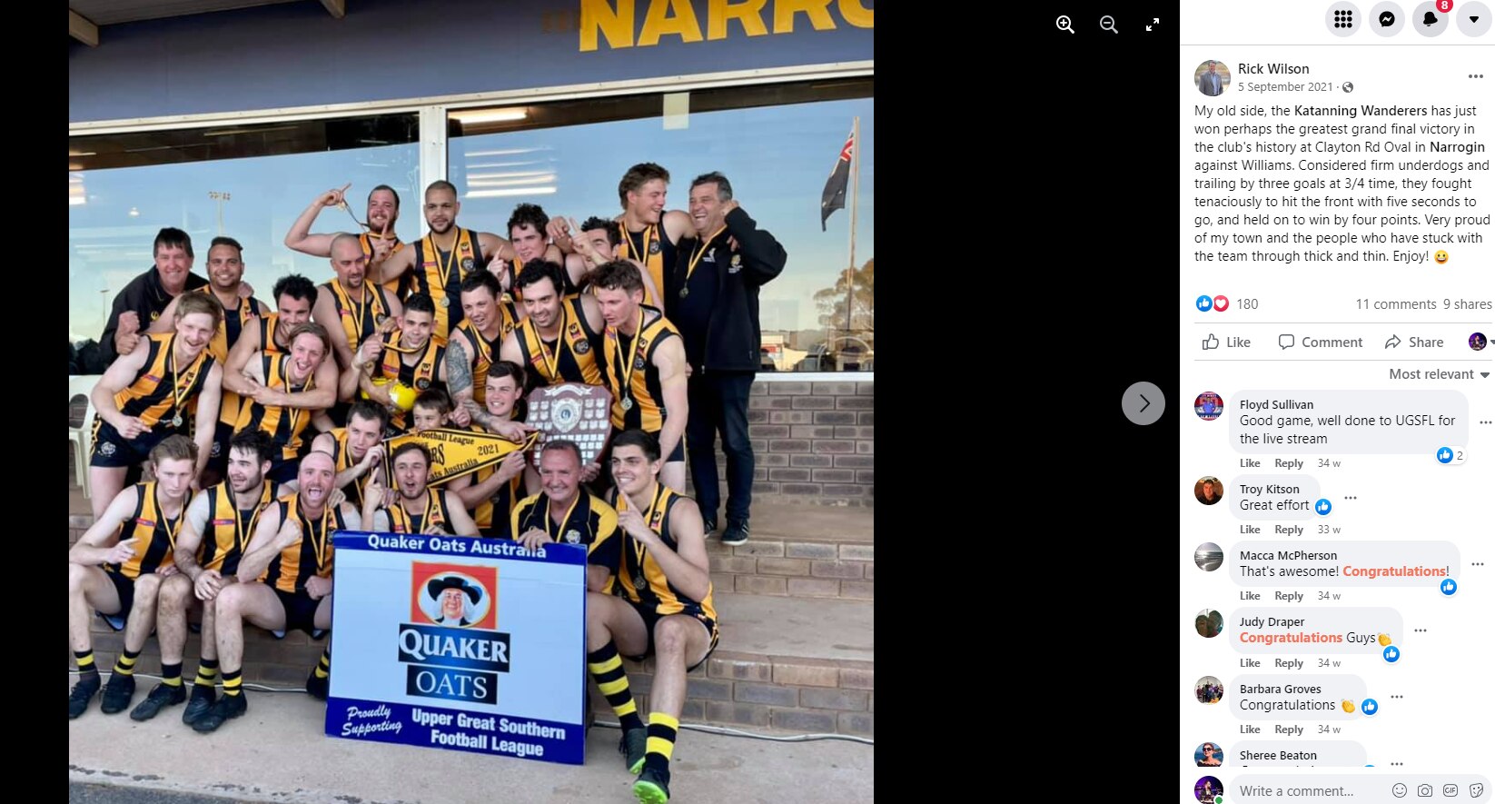 "My old side, the Katanning Wanderers has just won perhaps the greatest grand final victory in the club's history at Clayton Road Oval in Narrogin against Williams," it read.