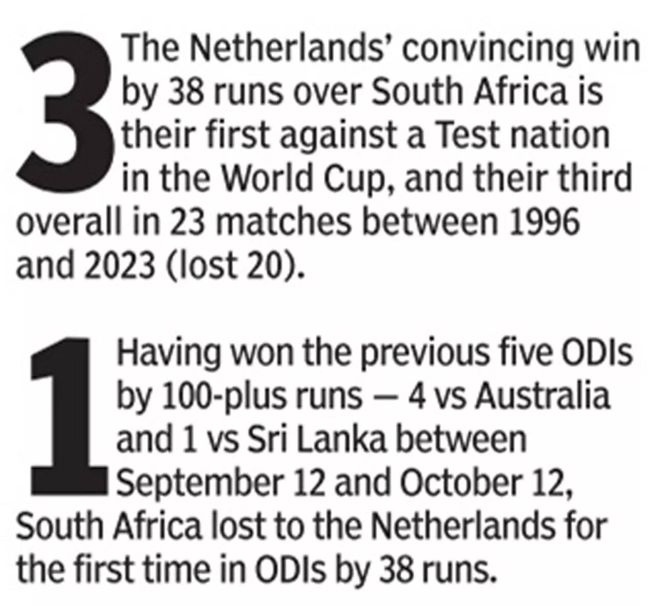 The victory was Netherlands first-ever against the Proteas and also their maiden World Cup victory against a Test playing nation in the 50-over format.