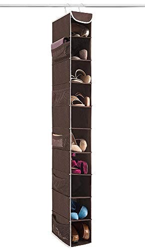 Whether you want to reclaim floor space in your closet or are just short on storage options, this hanging shoe rack is a nice space-saving solution. It has 10 separate compartments to hold 10 pairs of shoes. You can install it in a few seconds thanks to the swivel hooks that hang on the closet rod. There are also mesh pockets on the side for additional storage to hold things like socks or belts.