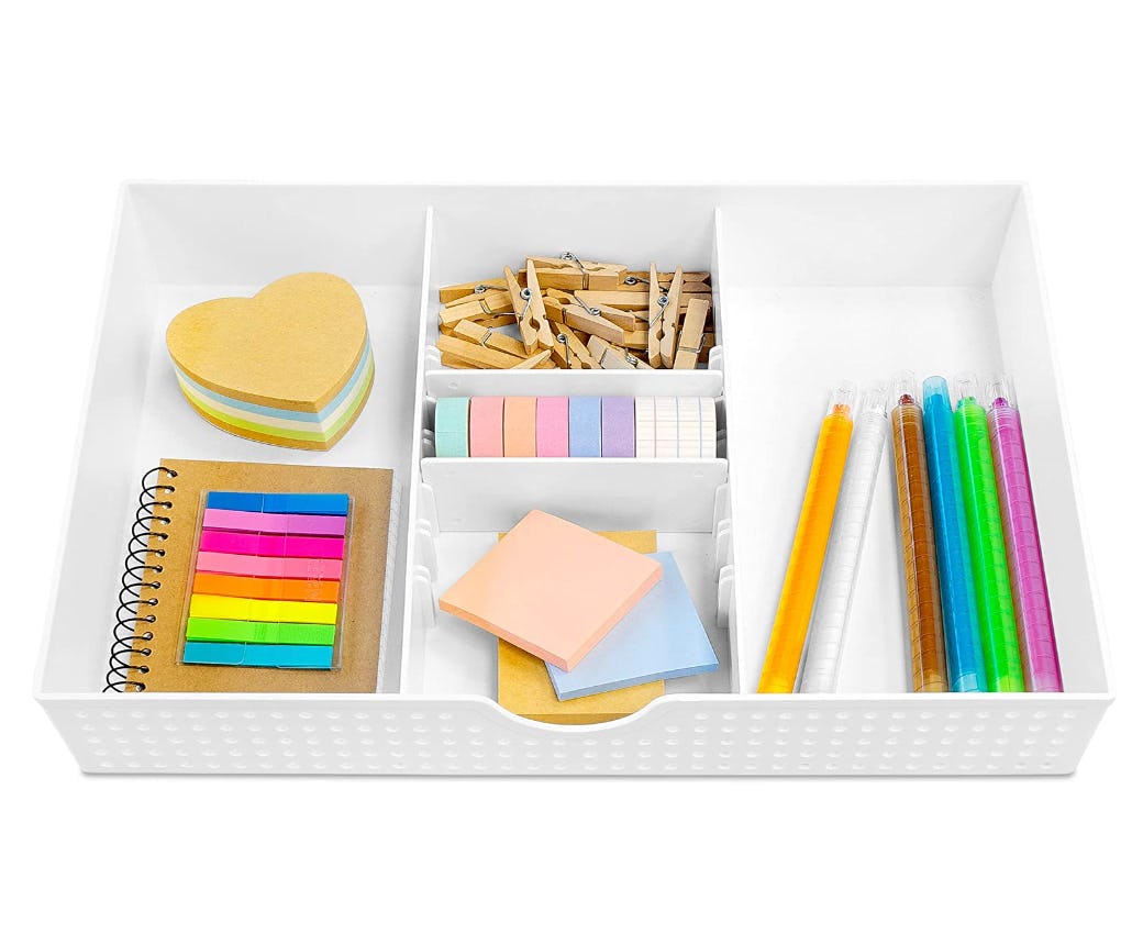 This plastic drawer organizer is customizable enough to tidy up your desk, vanity, or even bathroom drawers. It’s all about the middle section that has two adjustable dividers and a bunch of slots for arranging them to fit office supplies, toiletry products in your bathroom, and more.