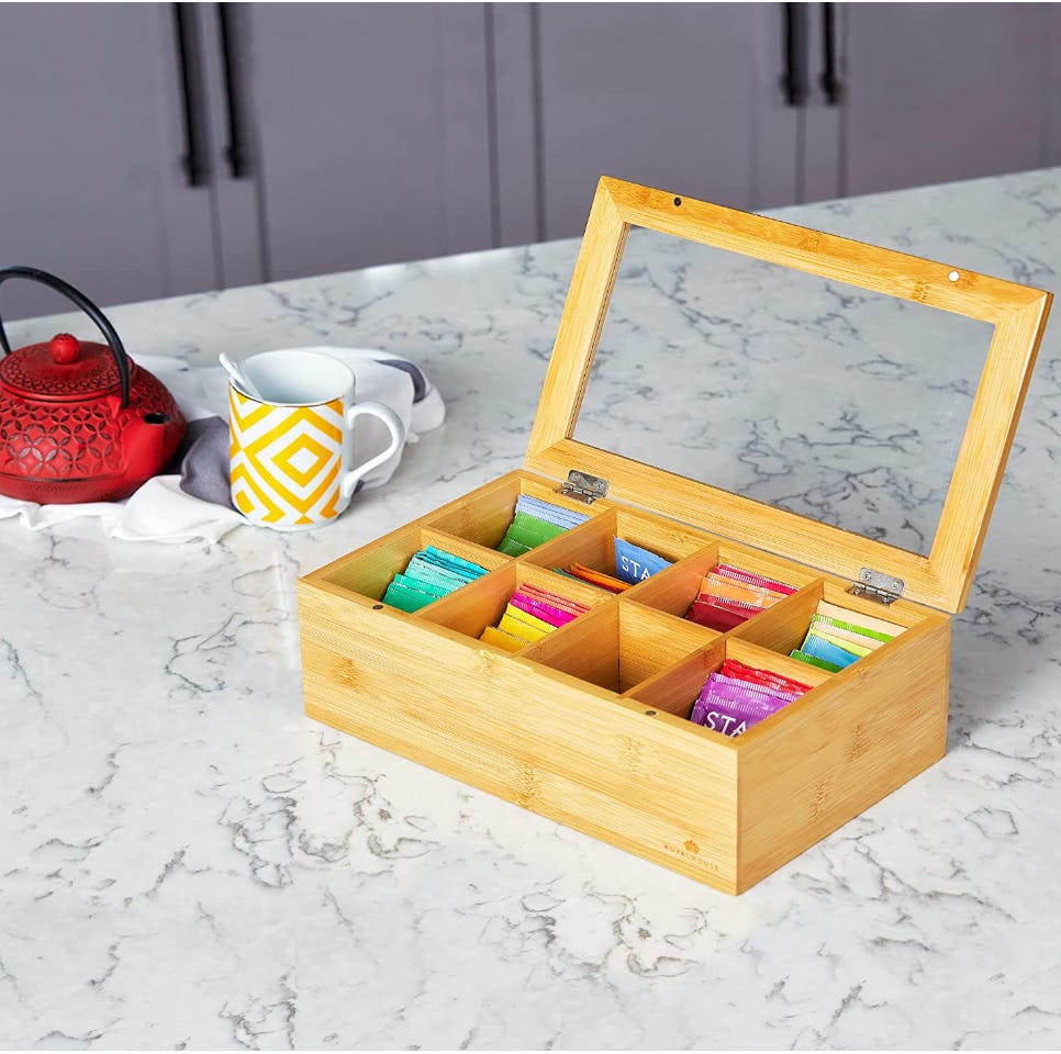 This water-resistant tea box is such a chic kitchen organizer because it has a bamboo finish, and it will display all of your colorful tea bags. The clear top lets you see when you’re running low on your go-to peppermint tea or pouches of hot chocolate.