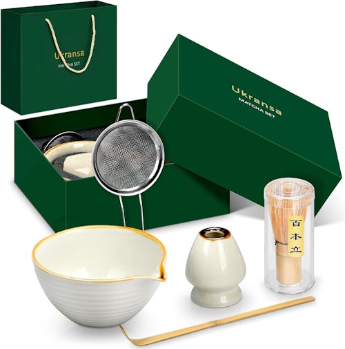 This matcha set provides all the tools you need to perfect a traditional cup of Japanese tea. It includes a hand-carved bamboo whisk, a ceramic whisk holder, a ceramic bowl with a spout, a wooden scoop, and a steel-mesh sifter, all in a green box for gifting or storage. “Absolutely stunning,” said one reviewer. “It’s perfect for my morning matcha ritual.”
