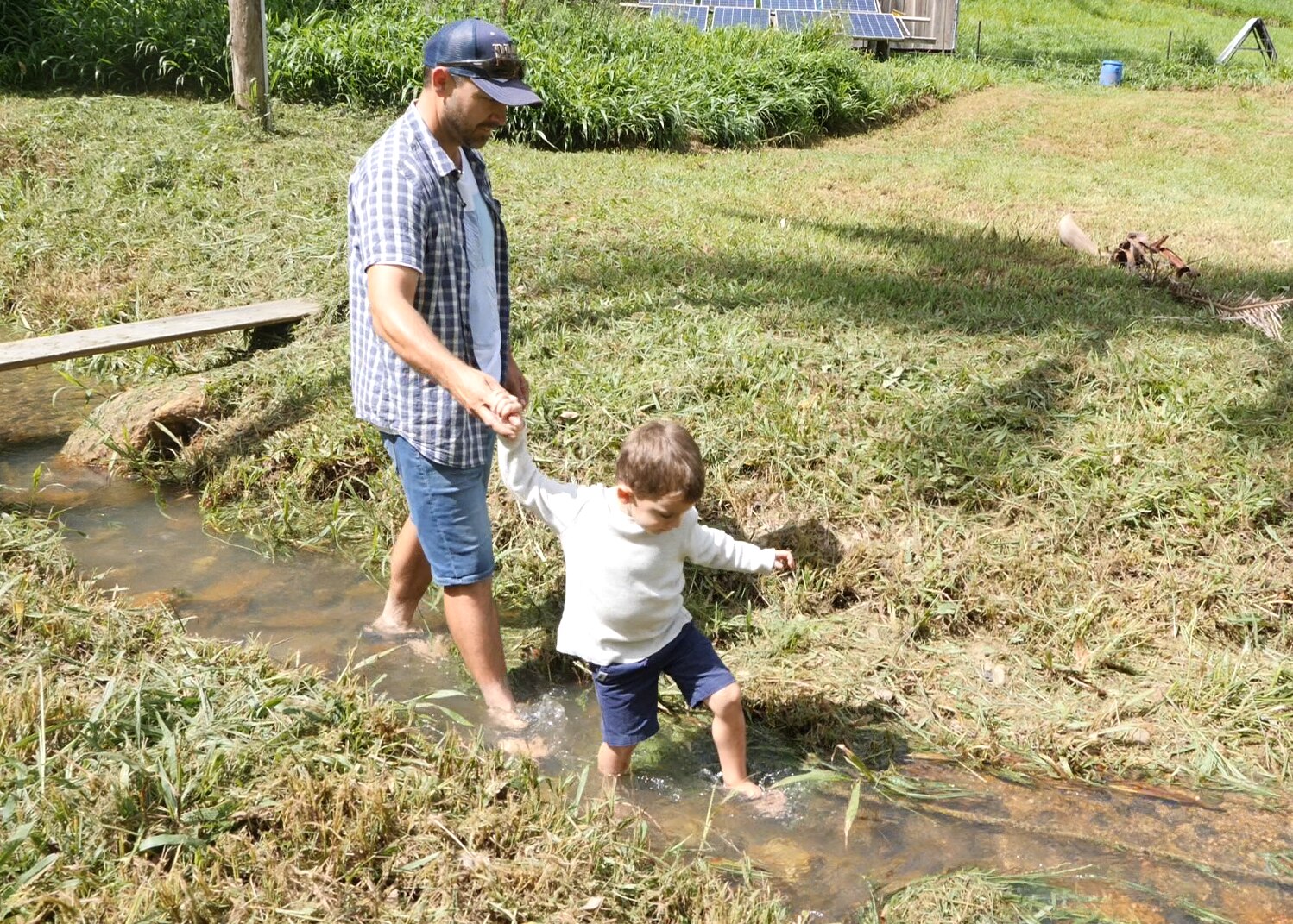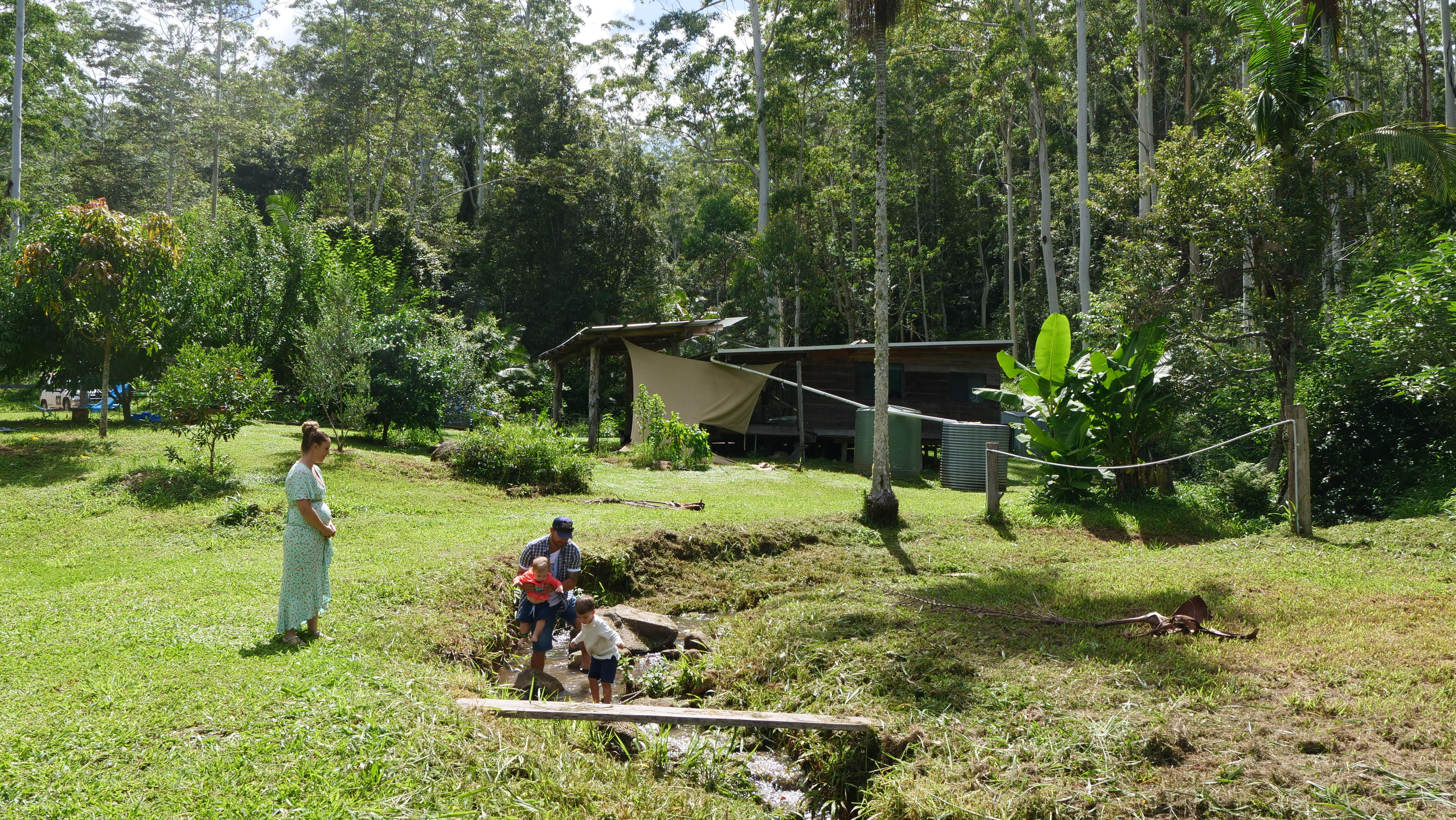 As sunlight streams through rainforest trees, Lauren and James Archer splash in a creek with their young children.