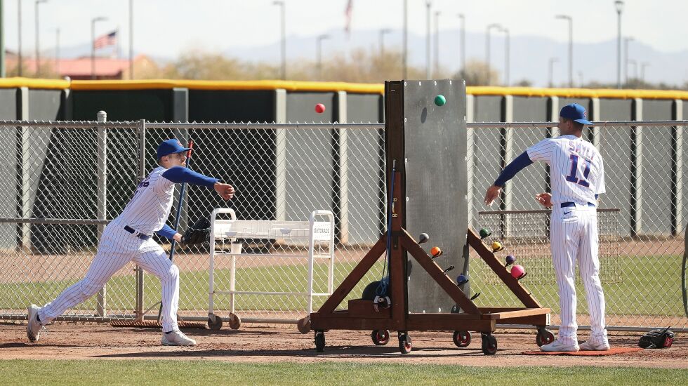 MESA, Ariz. — At the end of the line of pitching rubbers and home plates that make up the “12-pac” — a large outdoor bullpen at the Cubs’ spring-training complex — sits a triangular wooden structure supporting a rubber mat-clad wall.