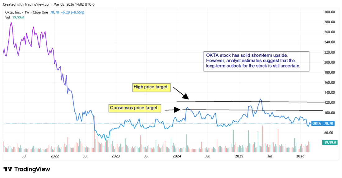 Okta Inc. (NASDAQ: OKTA) stock shot up more than 10% the day after the cybersecurity company delivered a double beat in its Q4 earnings report for its 2026 fiscal year. For shareholders who have been holding the stock, the rally feels overdue. Even with the post-earnings surge, OKTA stock is still about 30% below its consensus price target.