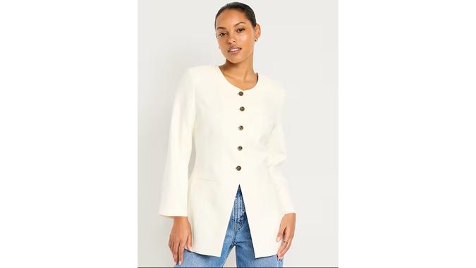 Beyond chic, this long blazer is offered in petite, tall and regular sizes. Available in black or white, it has a collarless neckline, bracelet-length sleeves and a vented center front — it’s even machine washable.