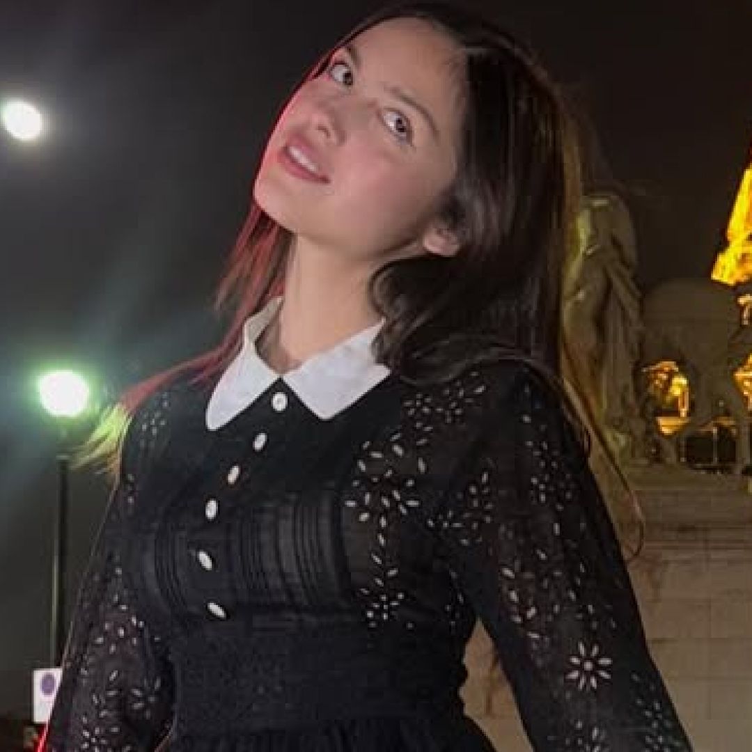 Turns out, Rodrigo didn't jet home to L.A. right after attending the Chloé Fall 2026 fashion show yesterday. Who would leave Paris without seeing the Eiffel Tower? The "déjà vu" singer posed in front of the twinkling landmark, wearing black-and-white, Parisian-inspired picks (her long-sleeve dress hailed from New York City-based designer Anna Sui, though). It was as flirty as minis get, starting with a collared, empire waistline. White buttons cascaded from the Peter Pan collar to her underbust, before eyelets punctured each flowy sleeve. The pointelle holes returned atop her dress's scalloped, thigh-grazing mini skirt. Rodrigo playfully curtseyed in the photo, showcasing each sleeve's white, tuxedo-like cuffs.