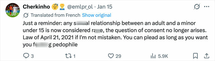 Prosecutor Edwige Roux-Morizot said “the facts constitute r*pe and s*xual as*ault due to the age difference, because the justice system considers that there is genuine moral duress.”