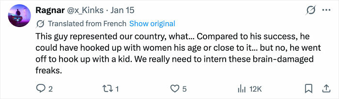 Tweet screenshot showing a translated message discussing an Olympic gold medalist charged with crime against a former coach's daughter.