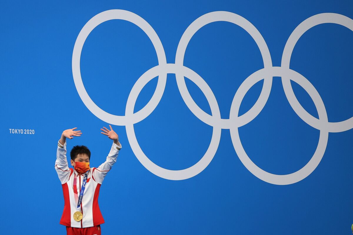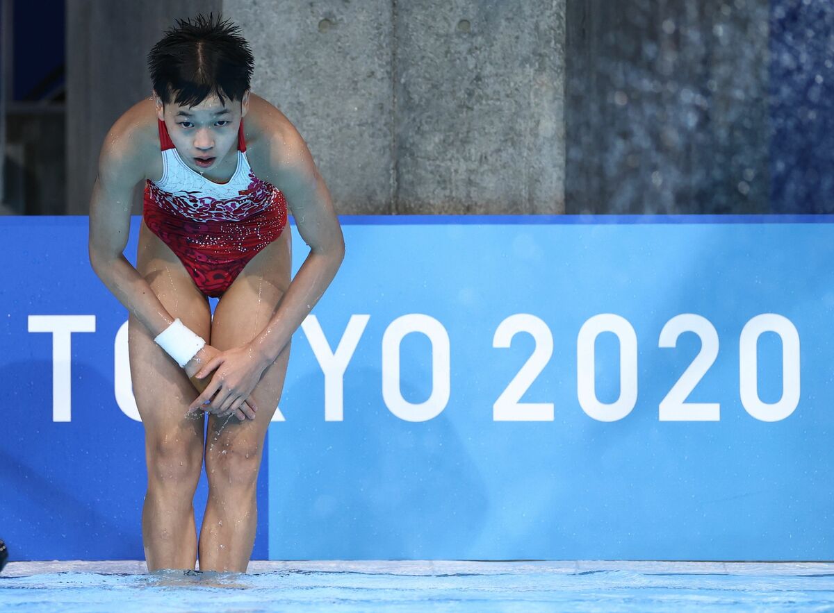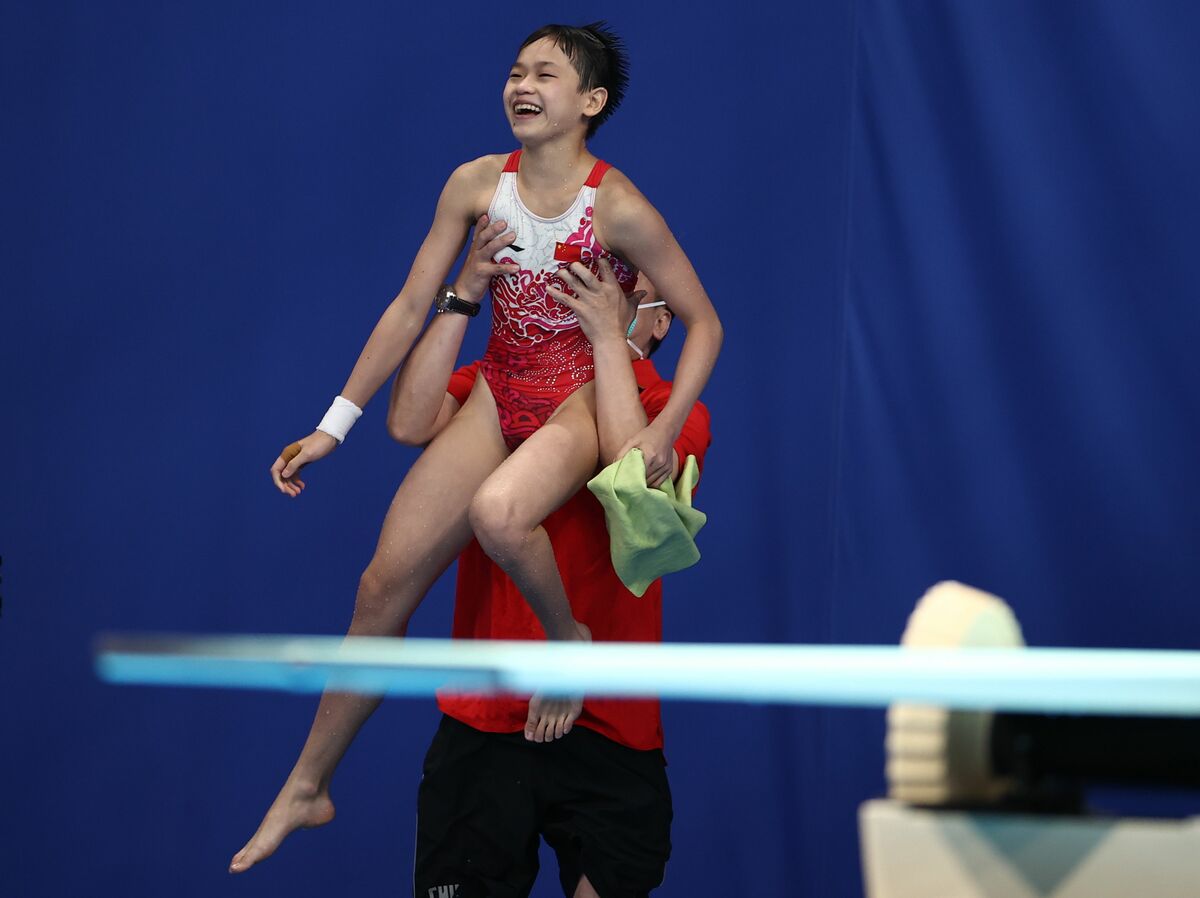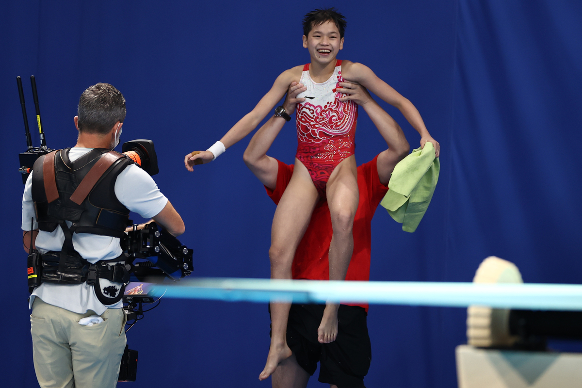 Her performance was met with resounding cheers from onlookers, including Shi Tingmao and Xie Siyi, who won their own diving golds in Tokyo and were frantically waving the Chinese flag.