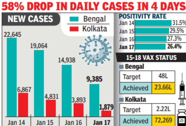 KOLKATA: Bengal completed vaccinating almost 50% of the eligible recipients in the 15-18 age group on Monday, even as the number of fresh Covid cases in Kolkata plunged below the 2,000-mark for the first time since December 31 last year, leading some experts to think that the peak of the third wave might be behind us.