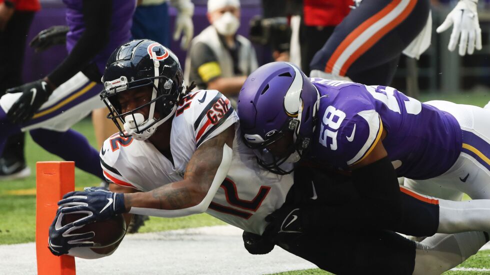 MINNEAPOLIS — Rookie receiver Velus Jones touched the ball on offense for the first time of his career Sunday — and scored. On first-and-goal at the 9 on the first drive of the third quarter, Jones went in motion from left to right and caught a touch pass from Fields on a speed sweep. He went around the right edge and plowed into the end zone.