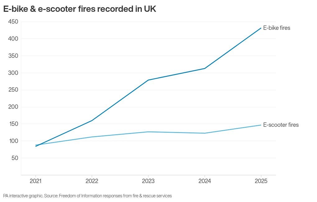 Fire brigade figures obtained by the Press Association show 432 e-bike blazes were recorded across the UK in 2025.