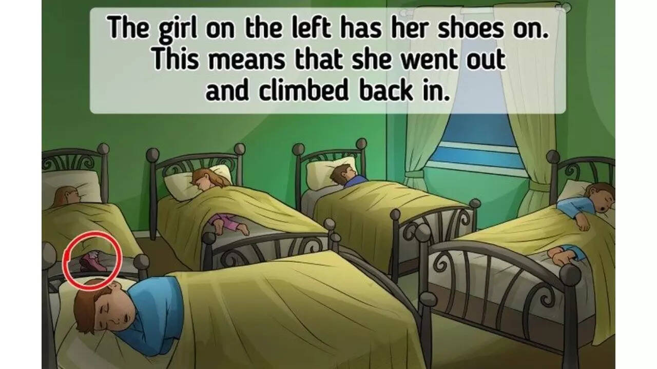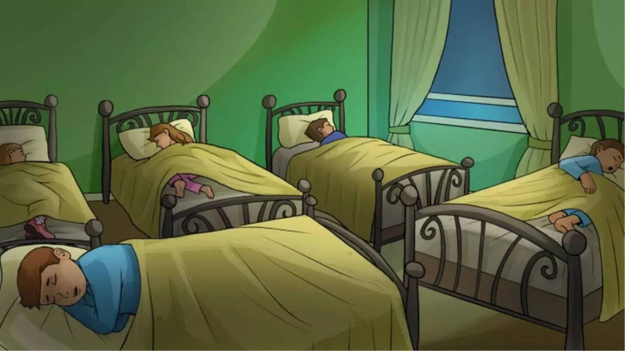 In the room, you can see three boys and two girls sleeping peacefully, totalling five children. So, which one of them is the mischievous child who sneaked out at night? Is it a girl or a boy? You have only 30 seconds to solve this puzzle. Let the countdown begin... Go! 30, 20, 10, 9, 8, 7, 6, 5, 4, 3, 2, and 1! Time's up!
