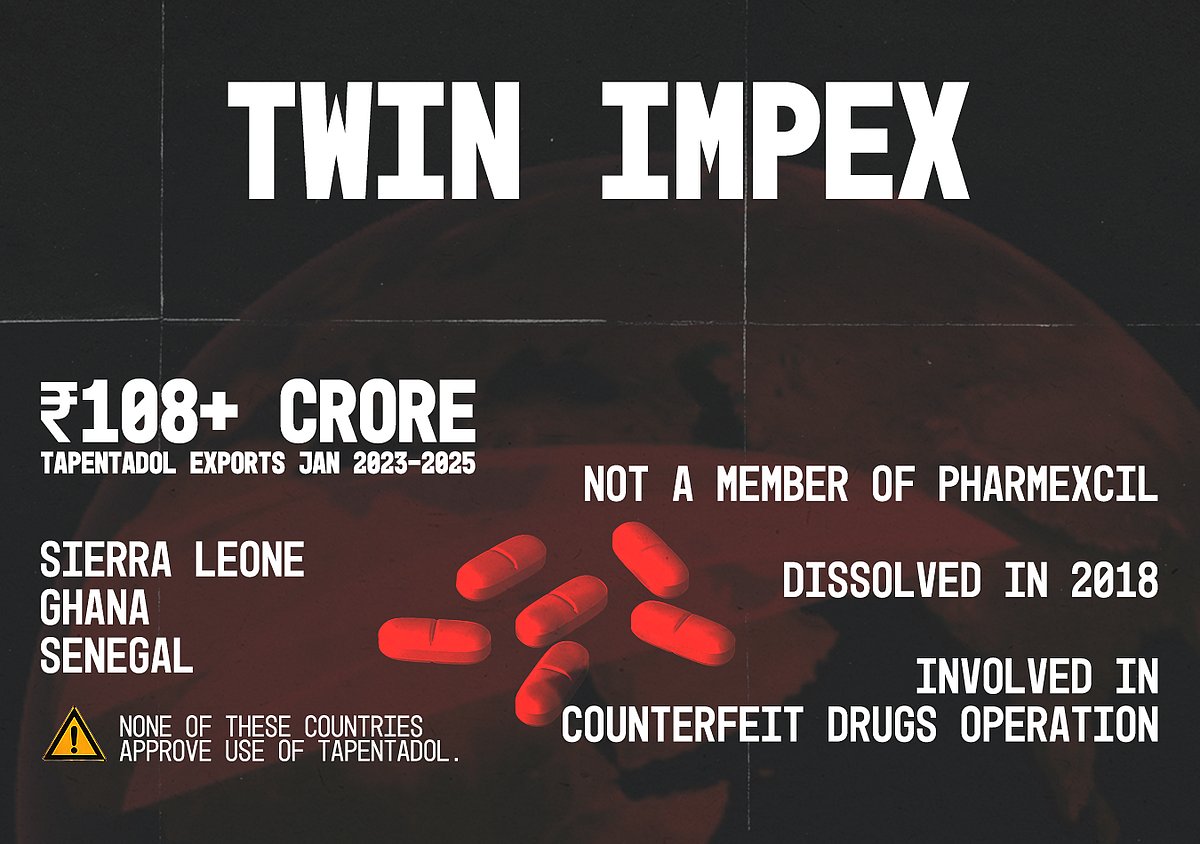 The third company, Twin Impex, exported  tapentadol worth over Rs 108 crore to Sierra Leone, with some pills also sent to Senegal and Ghana. But Twin Impex is not even a member of Pharmexcil. In fact, the Registrar of Companies records show that it was dissolved way back in 2018.