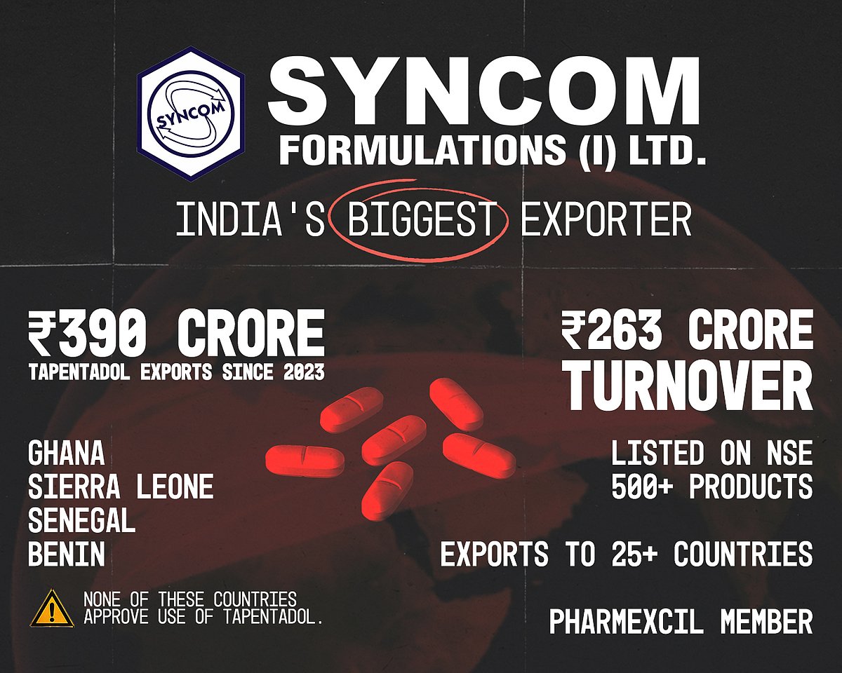 An Indore-based pharmaceutical company in Madhya Pradesh, Syncom Formulations (India) Limited, along with its subsidiaries Vincit Biotech International and Synmex Pharma, shipped nearly Rs 390 crore worth of tapentadol to Sierra Leone, Ghana, Senegal and Benin since 2023, the trade data say. None of these countries approve use of tapentadol.