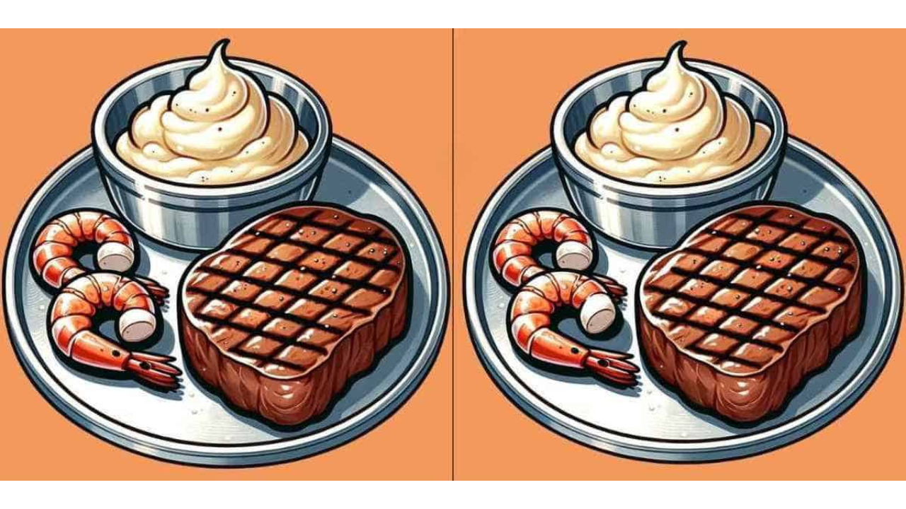Pictures of a dinner dish with two prawns, a bowl of mashed potatoes, and a piece of steak are shown in the image posted above.