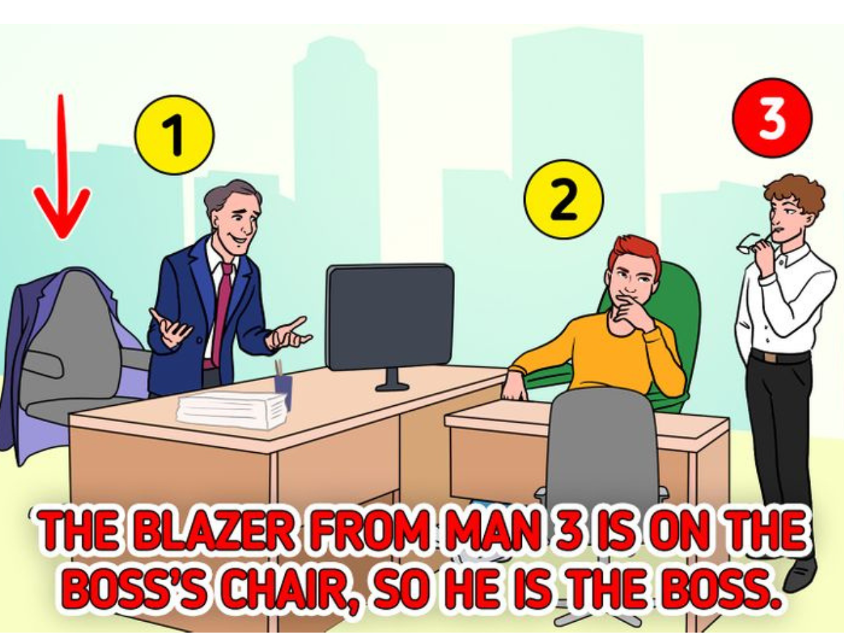 Who therefore among the three men is the true boss? Only in the office room is the solution concealed. Third person is in charge of the other two since his blazer is on the boss's chair.