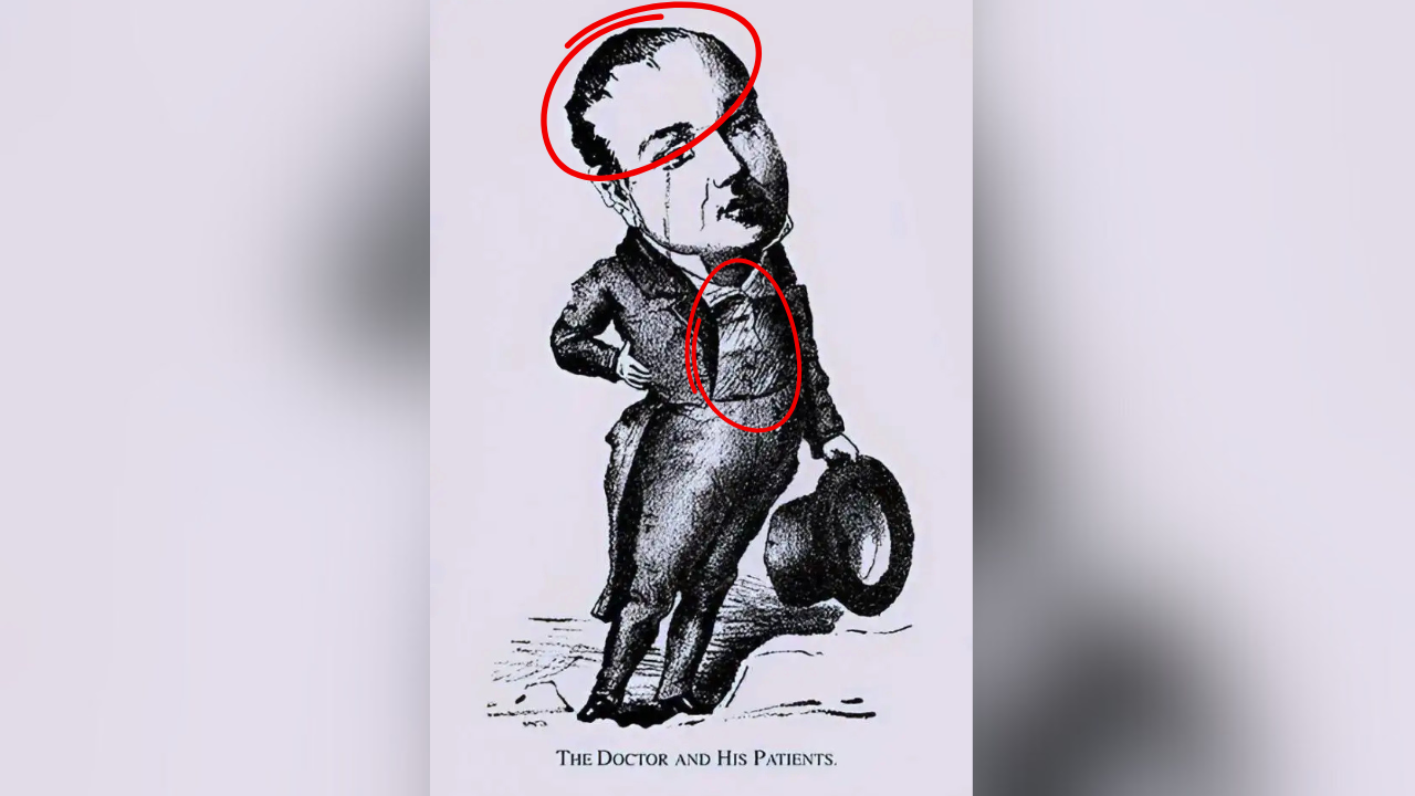 Patient on the doctor’s head: Look closely at the shape and texture of the doctor’s hair. You’ll notice that it actually forms the outline of a patient’s face!