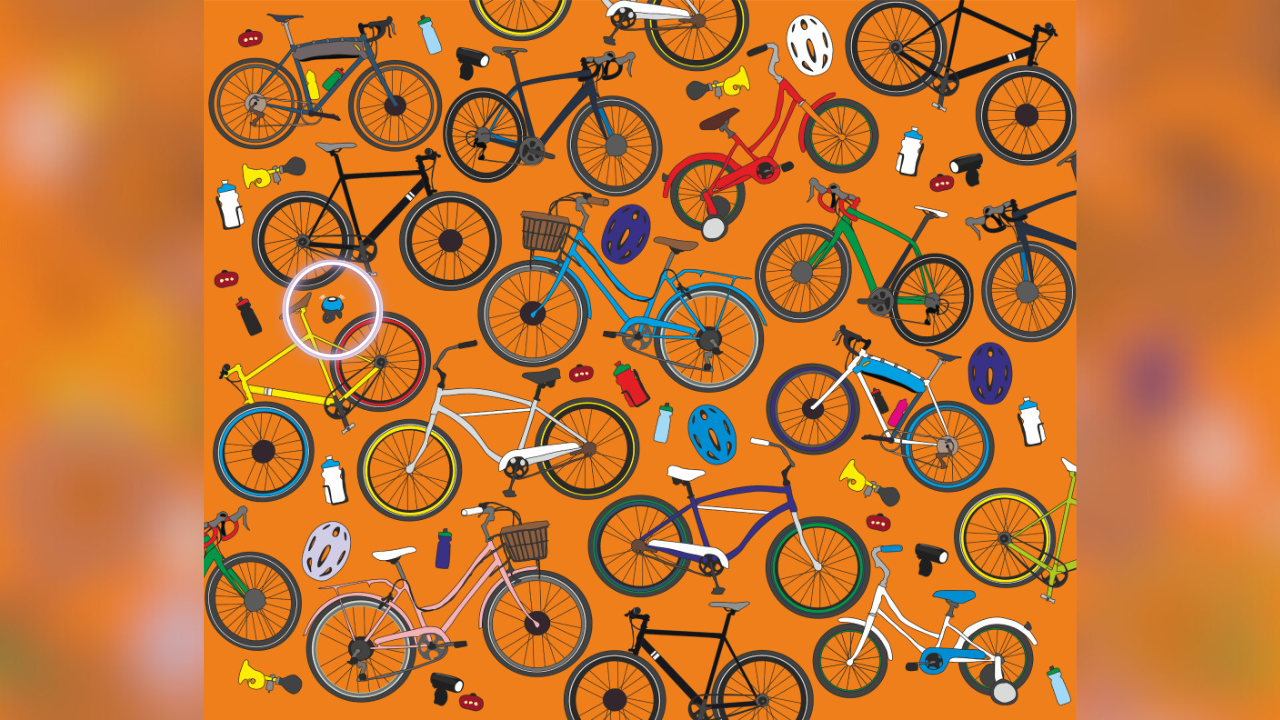 Take a look at the image. It’s a bright, colourful scene filled with bicycles of different colours and sizes, scattered in the background. The bikes are all at different angles, and there are other objects thrown in, such as helmets and water bottles. But somewhere in this picture is a hidden bell. Your task is to spot it in less than 9 seconds!