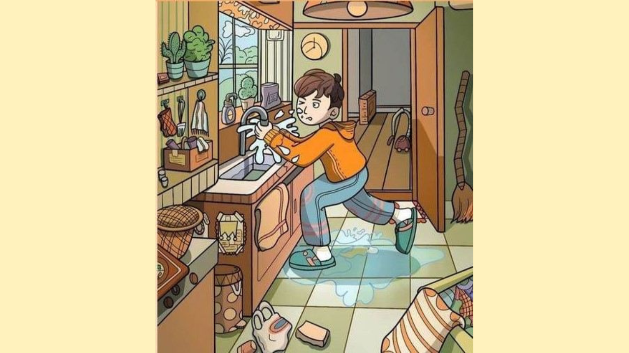 In this image, a kitchen is visible. The kitchen is unkempt, and you can see a boy doing the dishes. He can see a water puzzle beneath his feet and the kitchen is cluttered with items. Furthermore, with closer inspection of this kitchen's condition, you will discover that something does not belong there. You guessed it, indeed. This visual puzzle exam has a crown hidden in the kitchen. Will it be visible to you? in the allotted time?