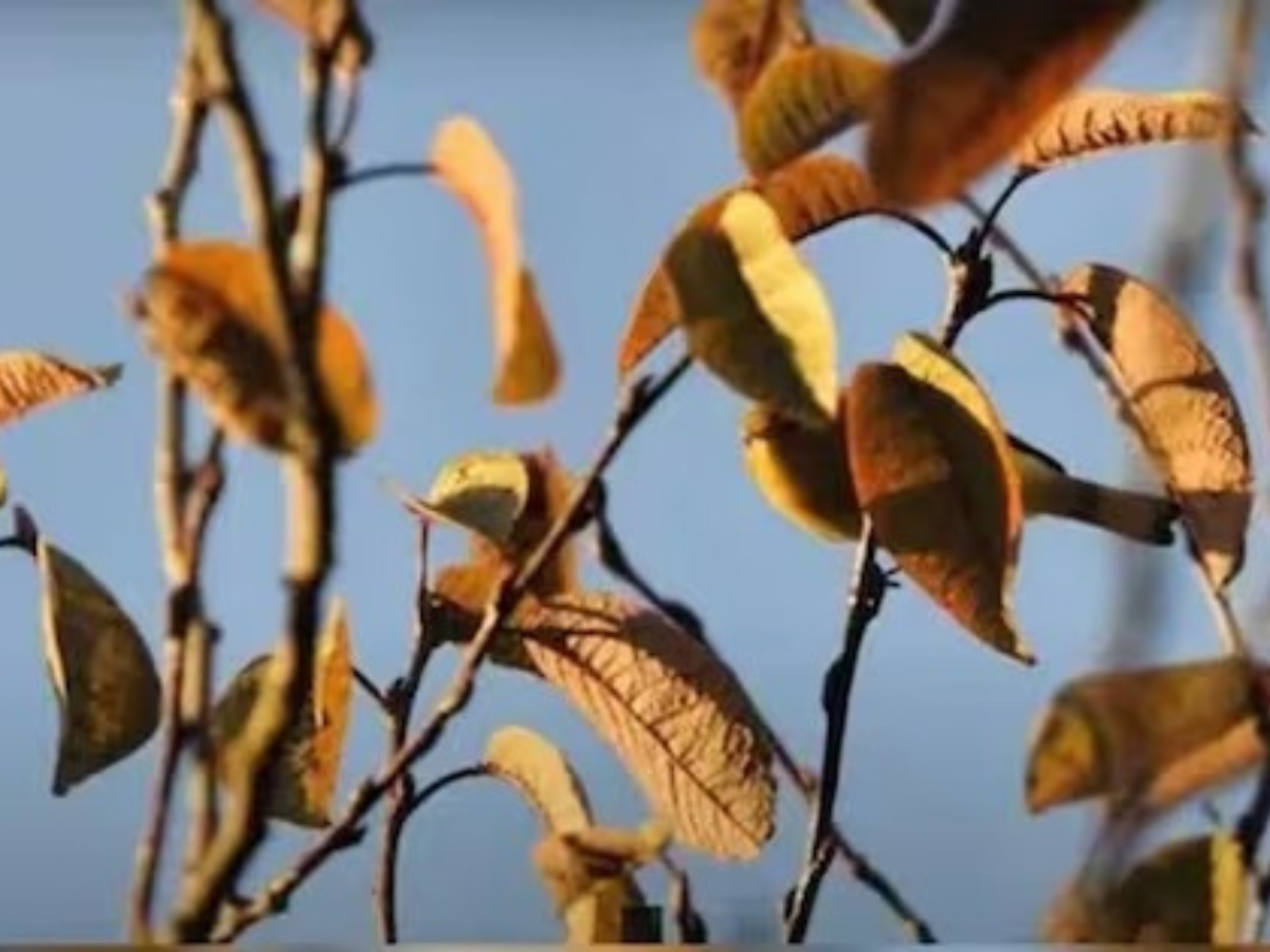 A group of brown, dead leaves is depicted in the picture, with blue skies in the distance. A bird must be located by the viewers somewhere in the picture. The observers are only diverted by the leaves, twigs, and branches. They hinder someone's search and make it harder and harder to find the bird.