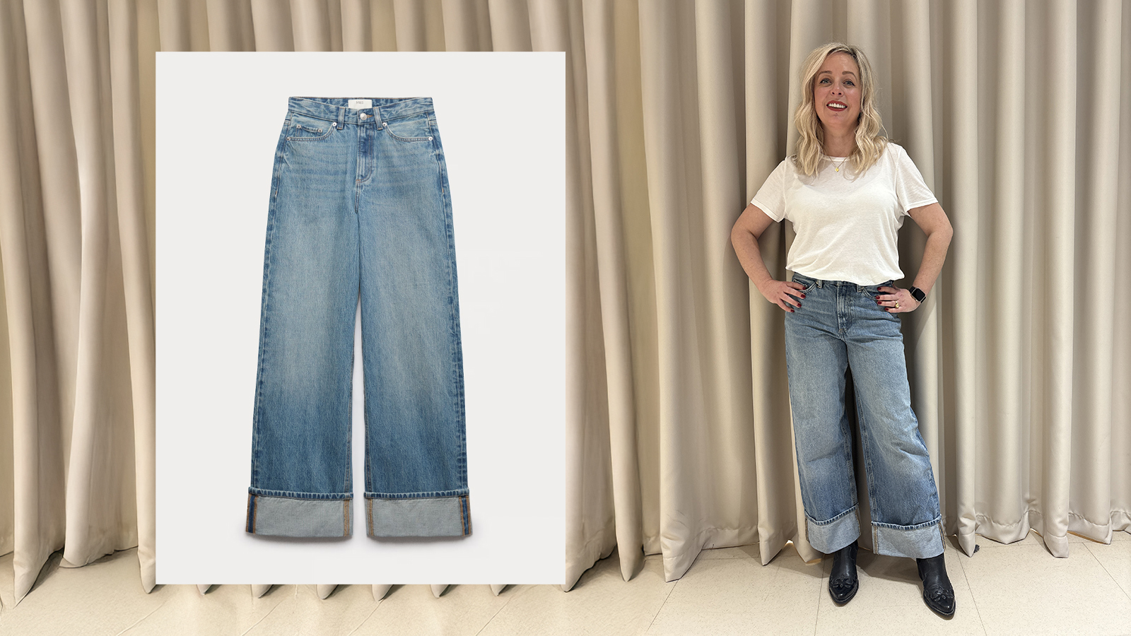 "I've tried on several pairs of turn-up wide-leg jeans, but until this pair, I'd never found the right style. Made of a rigid denim, they hold me in at the waist to create a smooth, lean shape, and the weightier denim means that they hang beautifully.