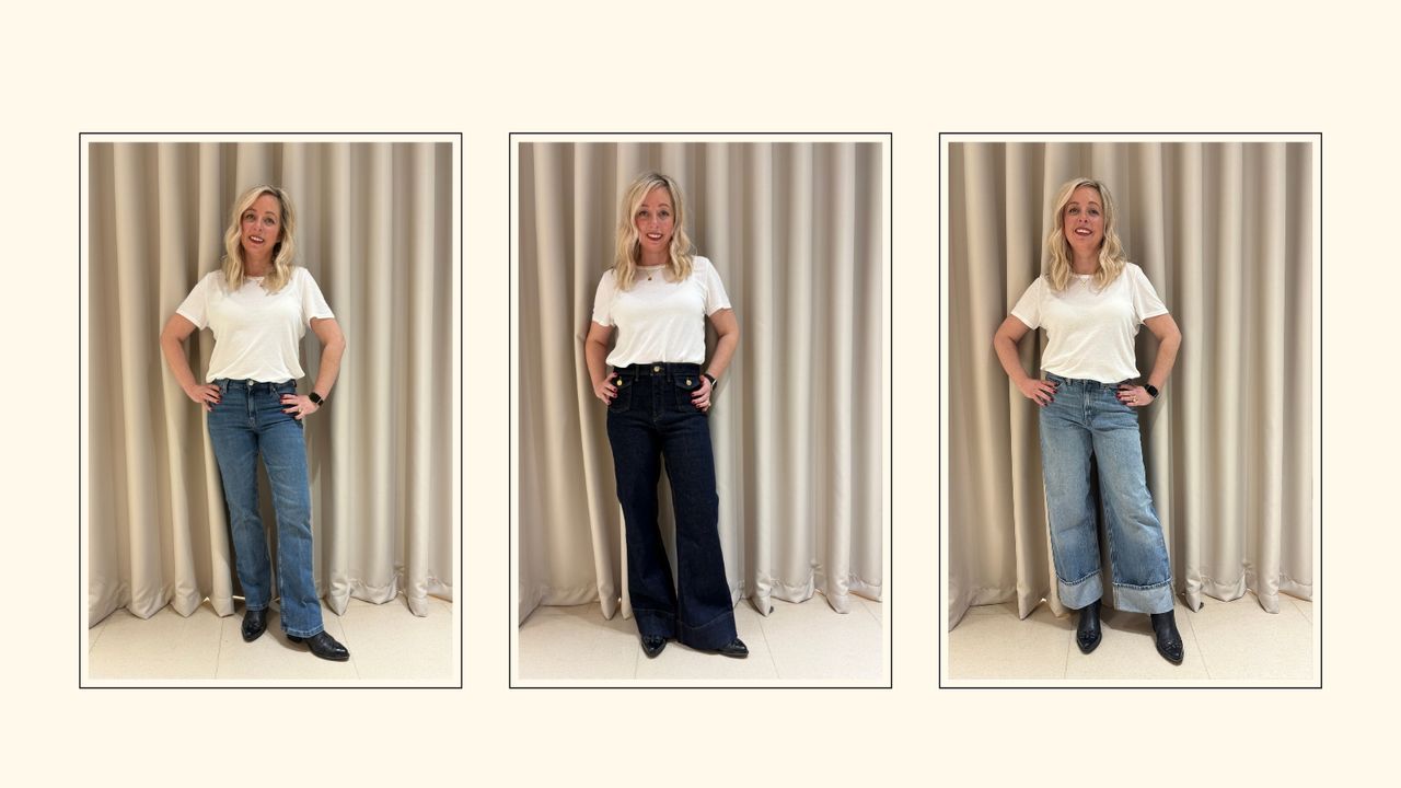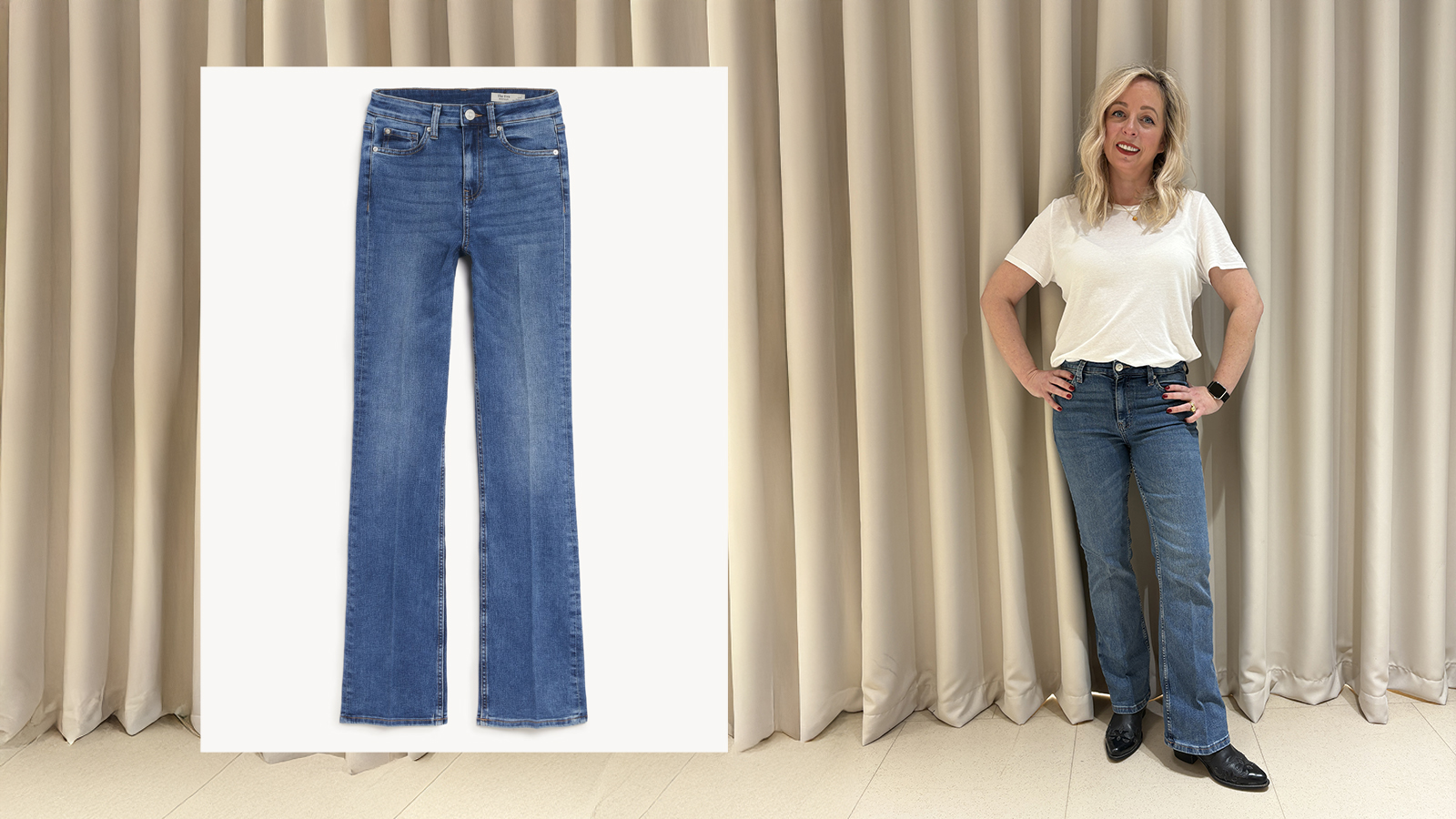 Bootcut jeans are a stylist's secret when it comes to balancing bottom-heavy frames, thanks to the slightly flared hem.