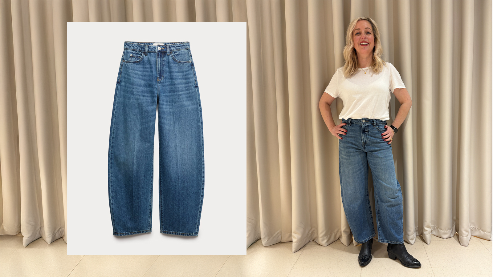 Unlike the mid-rise pair I tried, this style does not have the added panel, creating a slightly slimmer fit through the leg for those who want a more subtle take on the curved hem of barrel leg jeans without losing the unique silhouette. If you've been wondering what the best shoes to wear with barrel leg jeans are, look for more streamlined shoes such as ballet pumps, low profile trainers such as Adidas Sambas or slim-fitting ankle boots."