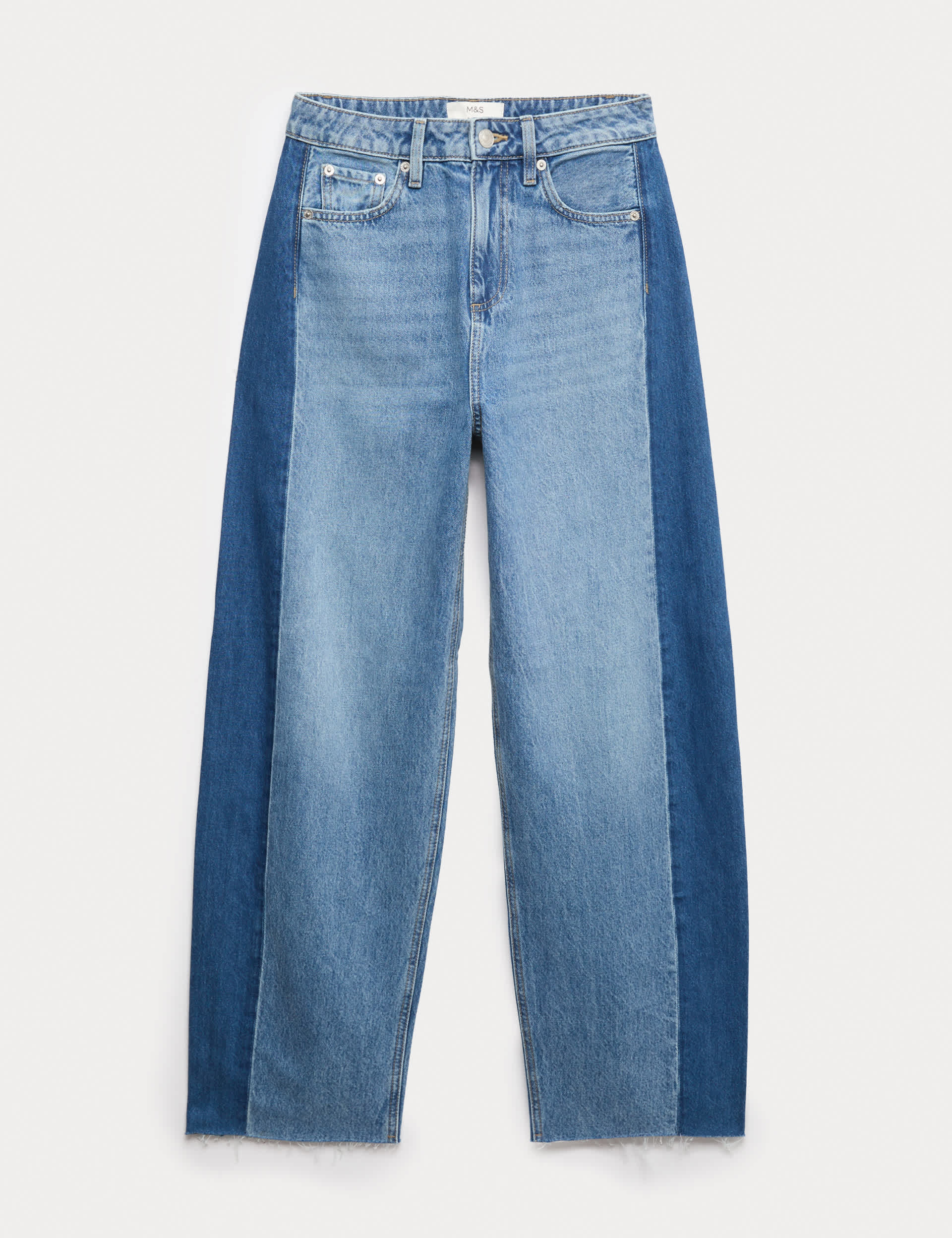 Barrel leg jeans aren't going anywhere, and this two-toned version makes them a great pair of slimming jeans.