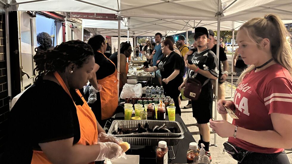 Along with Long and Shumer, several dozen people waiting in line were looking over items in Sterno trays, which included tacos; nachos with chicken, beef or buffalo chicken; Italian sausage; mostaccioli; fried chicken wings and legs; and, for dessert, coconut-lime lemonade cups or snowballs. Items ranged from $3 for chicken legs to $8 for Italian sausage with bell peppers, chips and water or pop, to $15 for three “fully loaded” tacos.