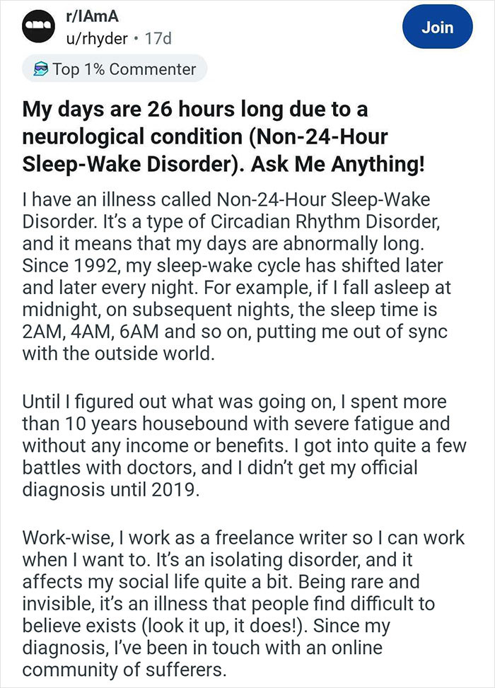 One person has described how instead of having a 24-hour day, he battles through a 26-hour day. The disorder even forced Michael Reed to be housebound for ten years, unable to work, socialize or live a semi-ordinary life. After sharing his journey online and inviting netizens to ask them anything, a surprising number of people came forward to reveal that they too suffer a similar fate.
