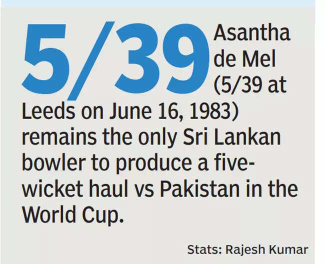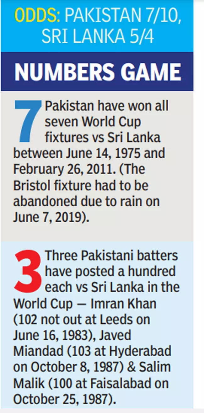 Sri Lanka are yet to defeat Pakistan in a World Cup encounter. While the two teams did not cross paths in 1979, 1996, 1999, 2003, 2007 and 2015, Pakistan won in 1975, 1983 (2), 1987 (2), 1992, 2011 and there was no result in Bristol in 2019.