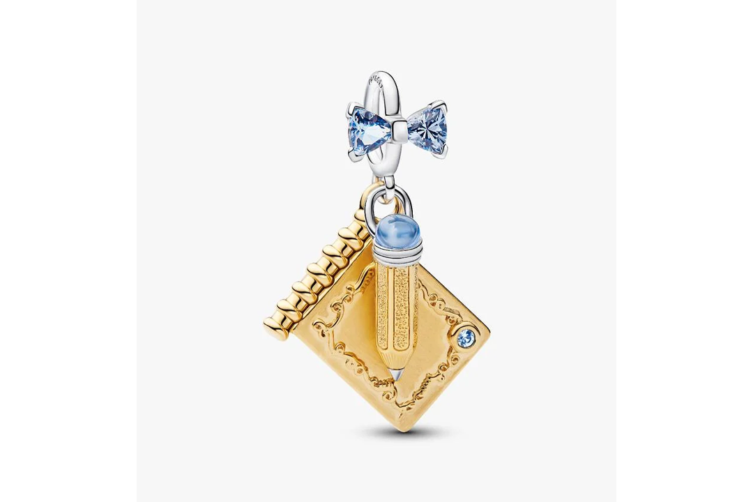 A particular highlight from the new collection is this charm inspired by the likes of Lady Whistledown’s dance card – it’s sure to go viral. The sterling silver design is plated with 14K gold, featuring blue crystals, a butterfly cut-out and even a sparkling pencil charm.