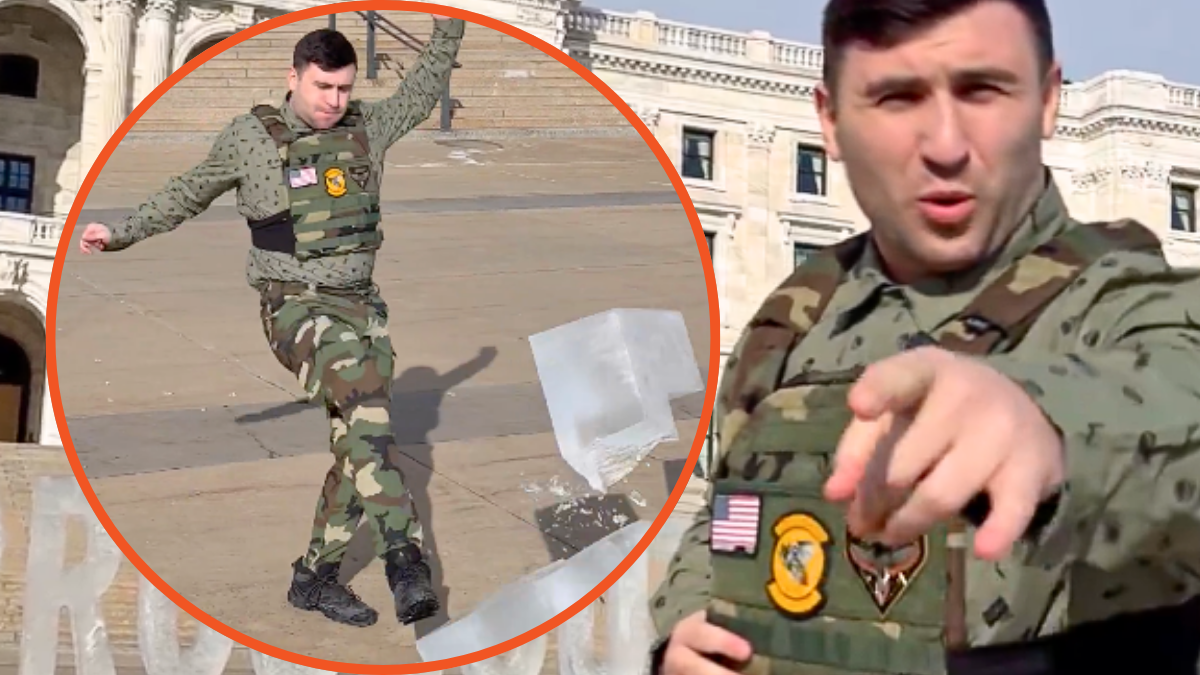 Minnesota police arrested far-right influencer and pardoned J6 insurrectionist Jake Lang after Lang posted a video on social media showing himself kicking over a permitted “Prosecute ICE” ice sculpture on the steps of the Minnesota Capitol on the same day it was erected. Lang, who is running for Senate in Florida, destroyed just enough for it spell out “Pro ICE” instead.