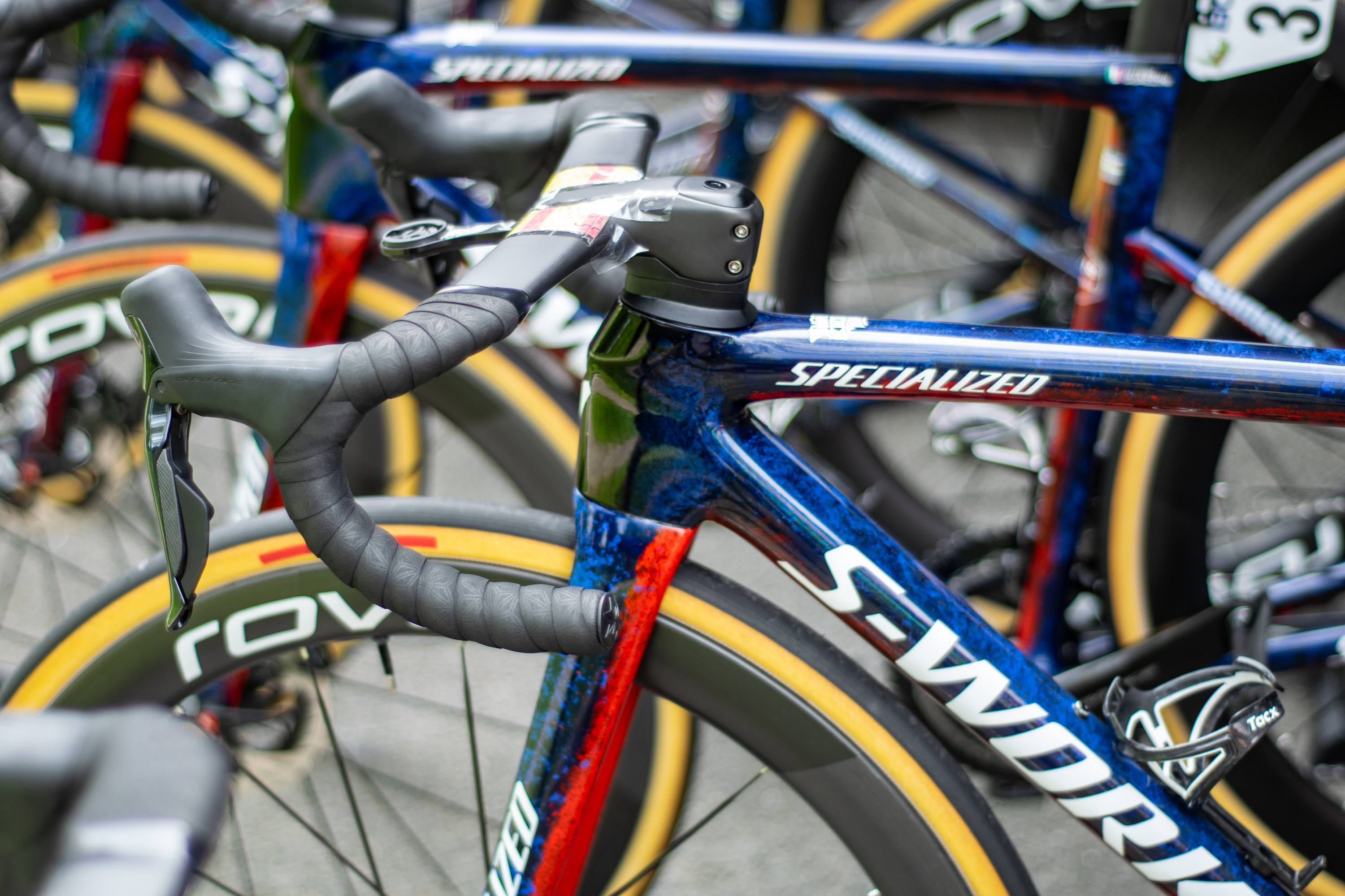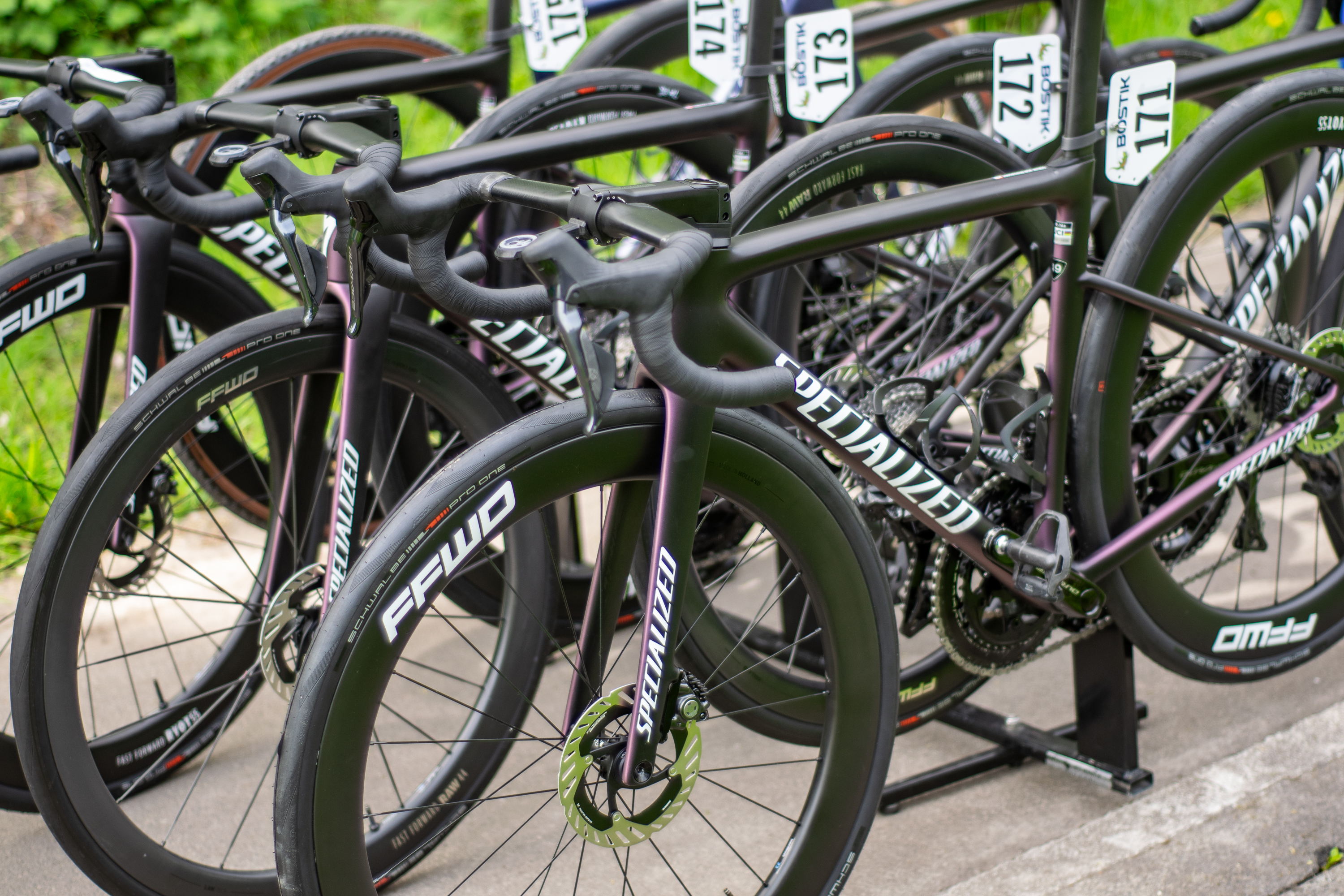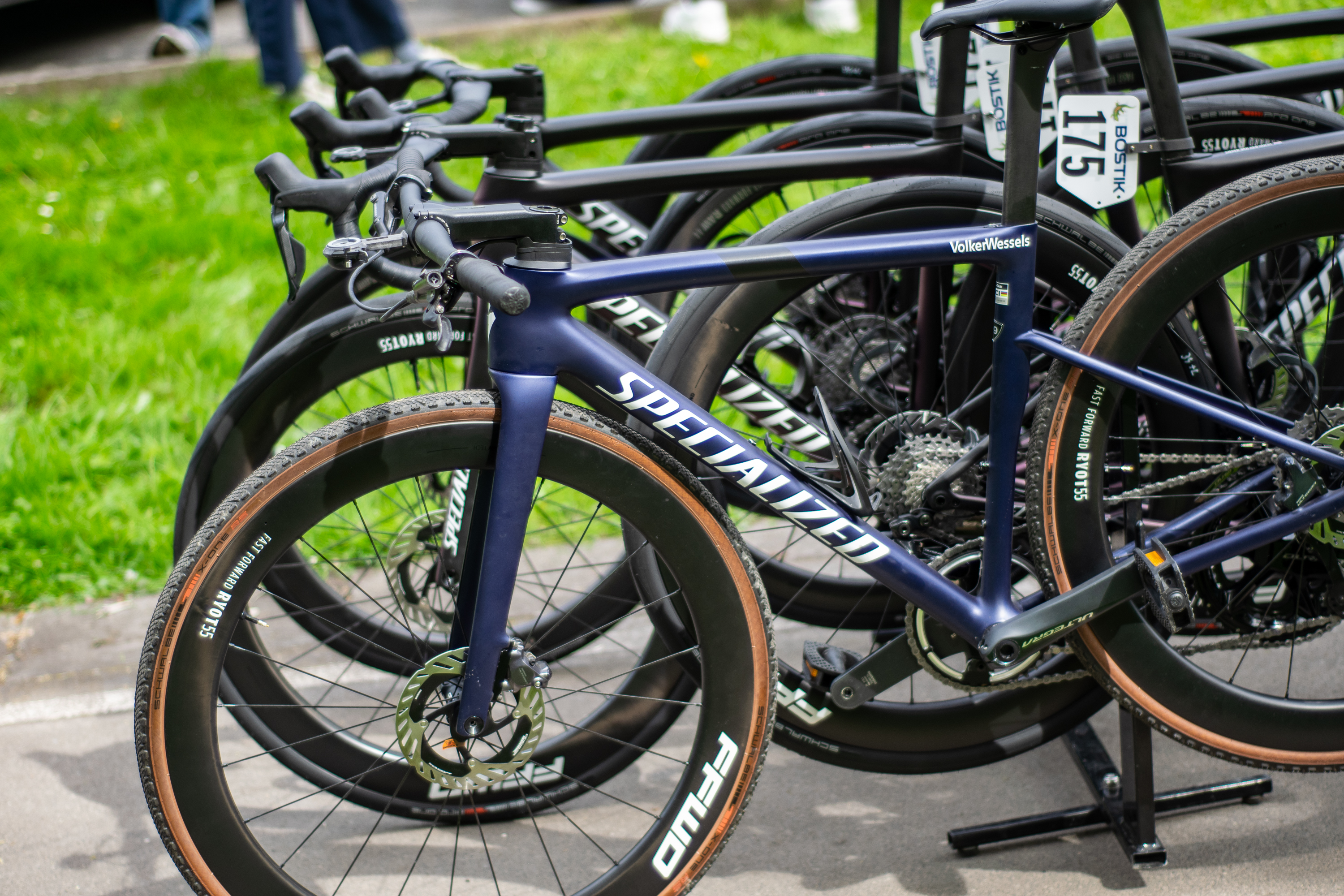 The Volkerwessels squad have some super stealth Specialized Tarmacs; the paint jobs just look mean. The team bikes had two-piece bars and stems, and the team ran tyre inserts.
