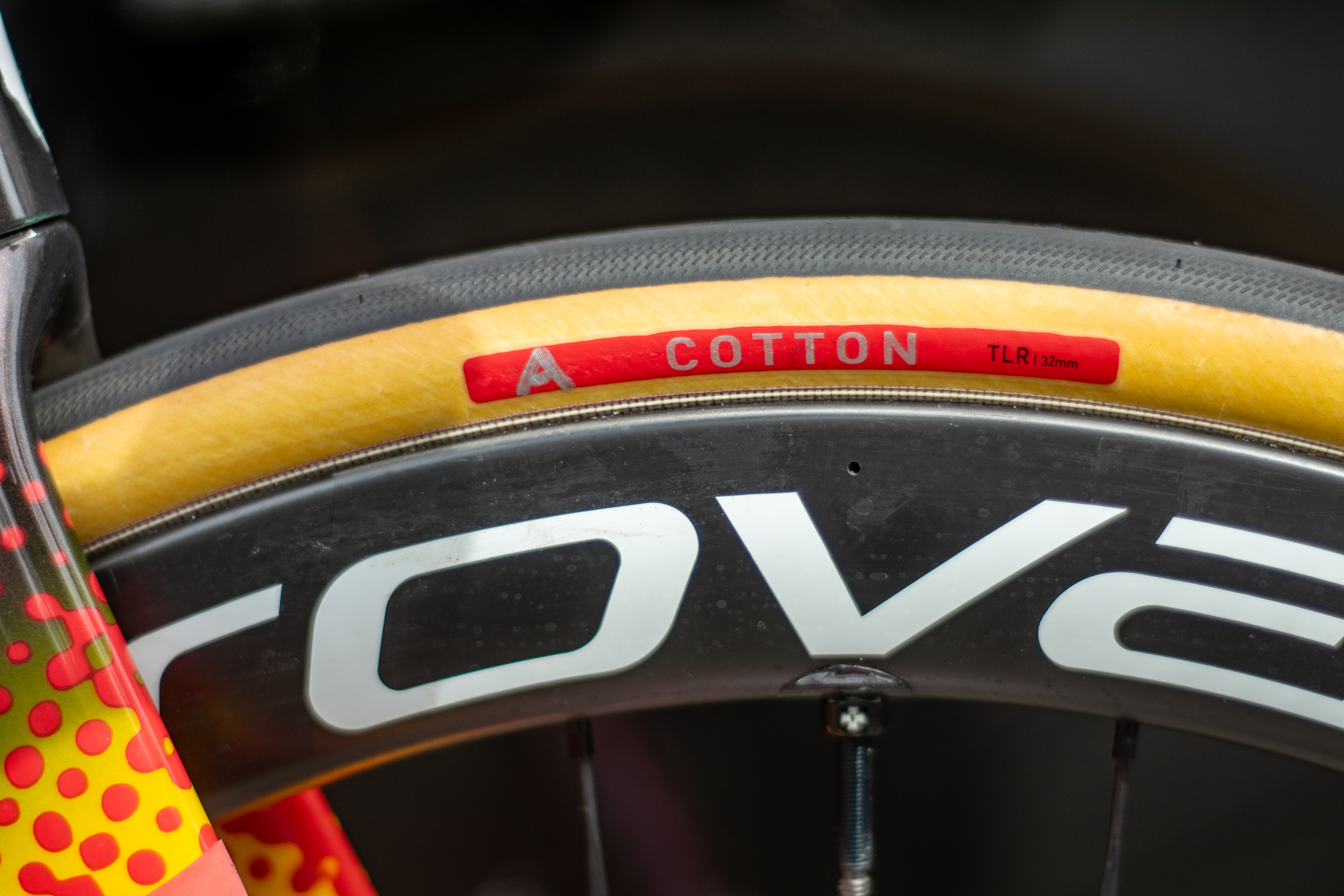 Kopecky was on the recently released Cotton TLR tyres from Specialized in a 32mm size, ‘A’ possibly denotes this being a race day or ‘best’ tyre.