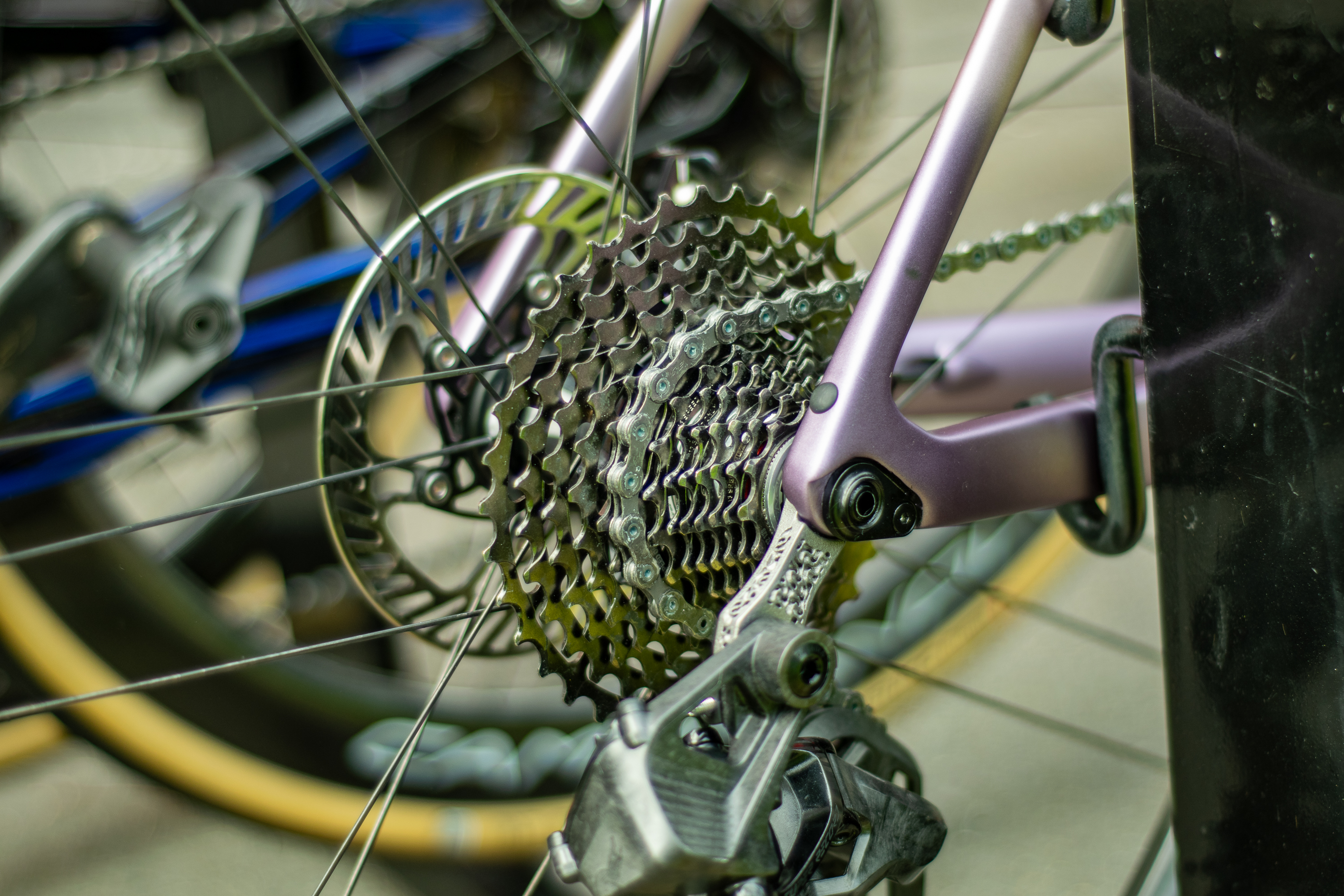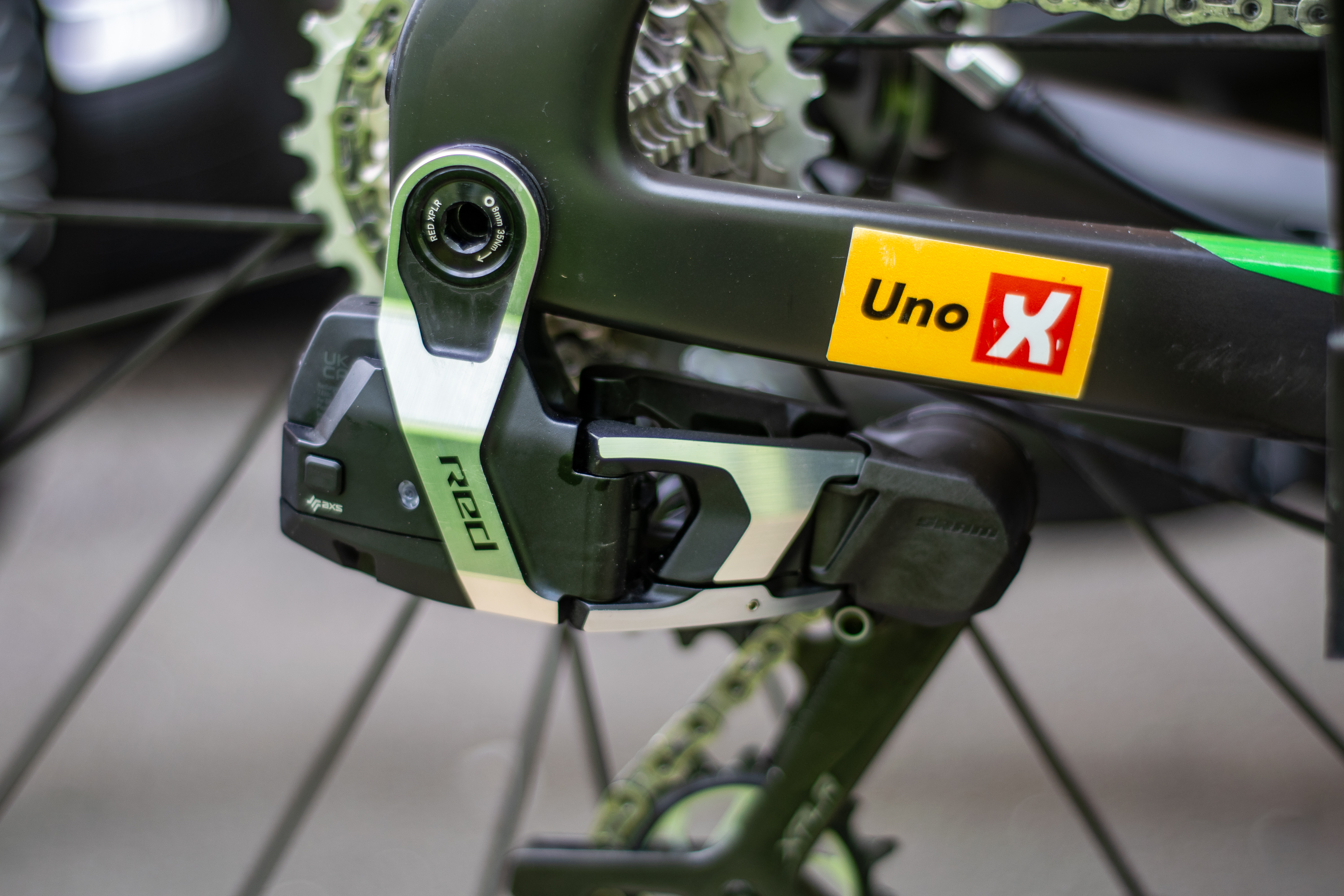 This Uno-X bike had me scratching my head for a minute. That’s an SRAM Red XPLR rear mech, but paired to a 12-speed road cassette, not the XPLR-specific 13-sprocket cassette. They'd drilled an extra limit screw to convert it to 12-speed. This gives you the durability of the gravel derailleur but the close-spaced gears of the road cassette.