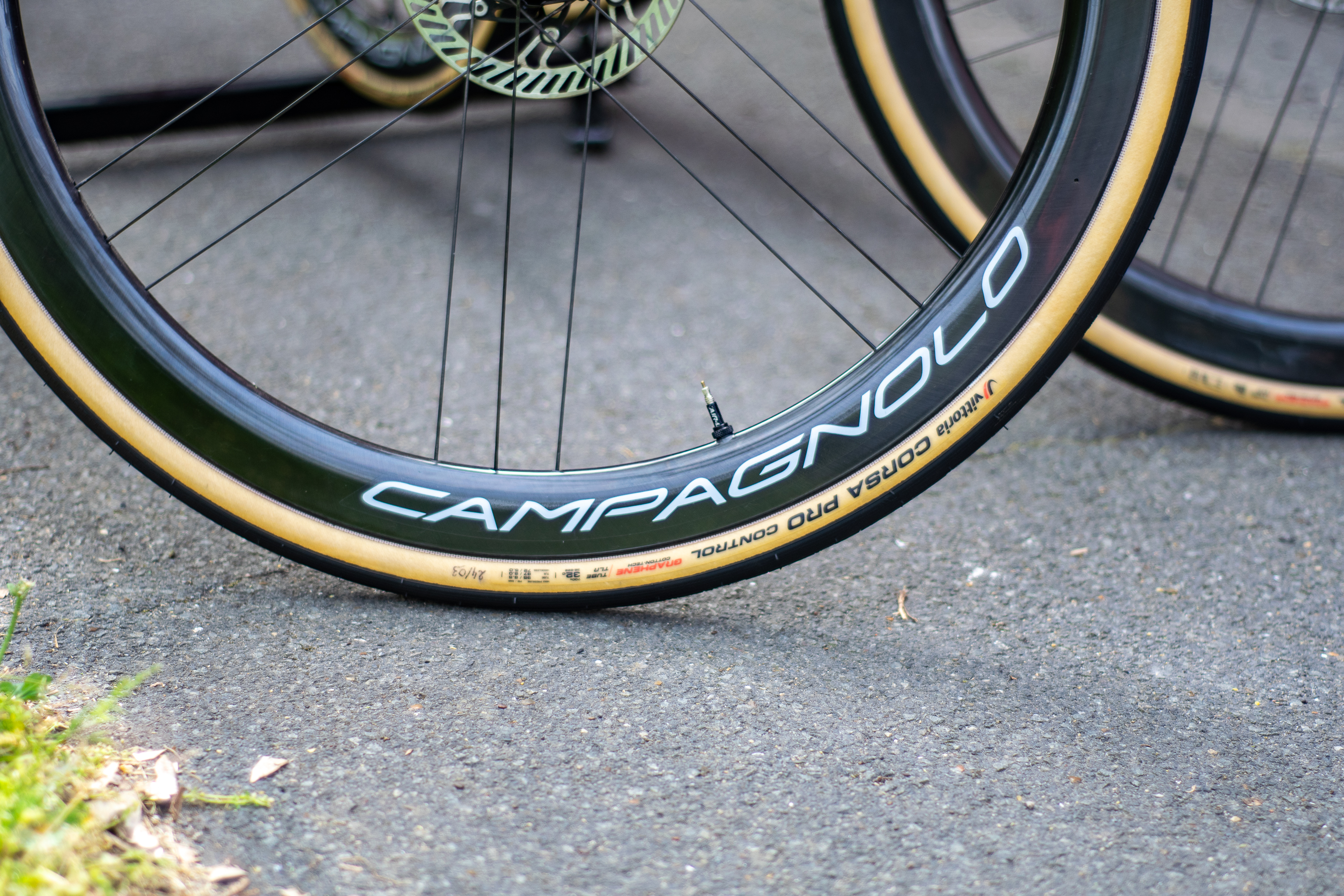 The team uses Campagnolo. The Bora wheels were fitted with 32mm Vittoria Corsa Control tyres.