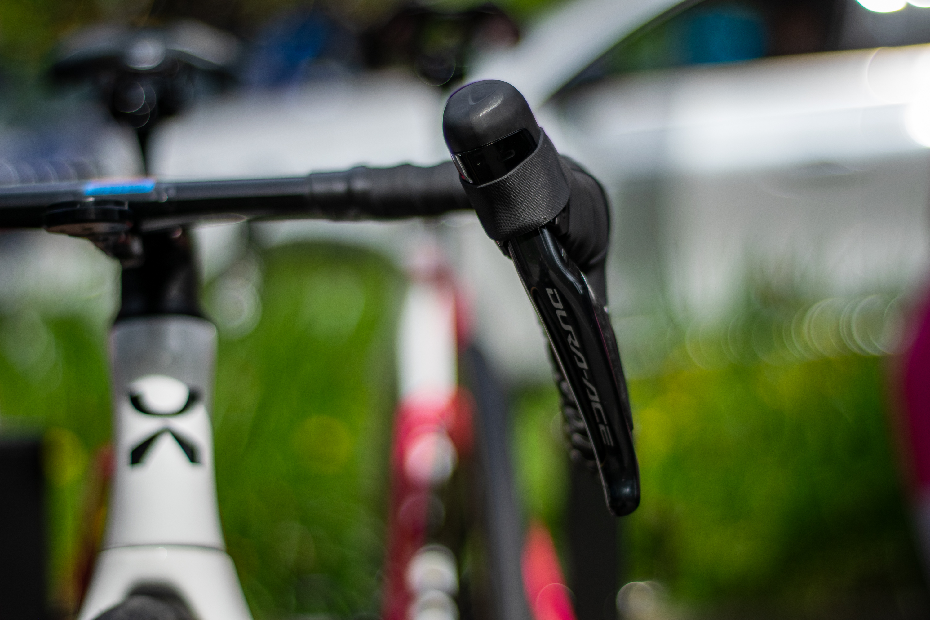 Here's a wild move, fully bar taped STI shifter hoods here, surely a bid to make things a touch more comfortable. Note the two different lots of bar tape, too.