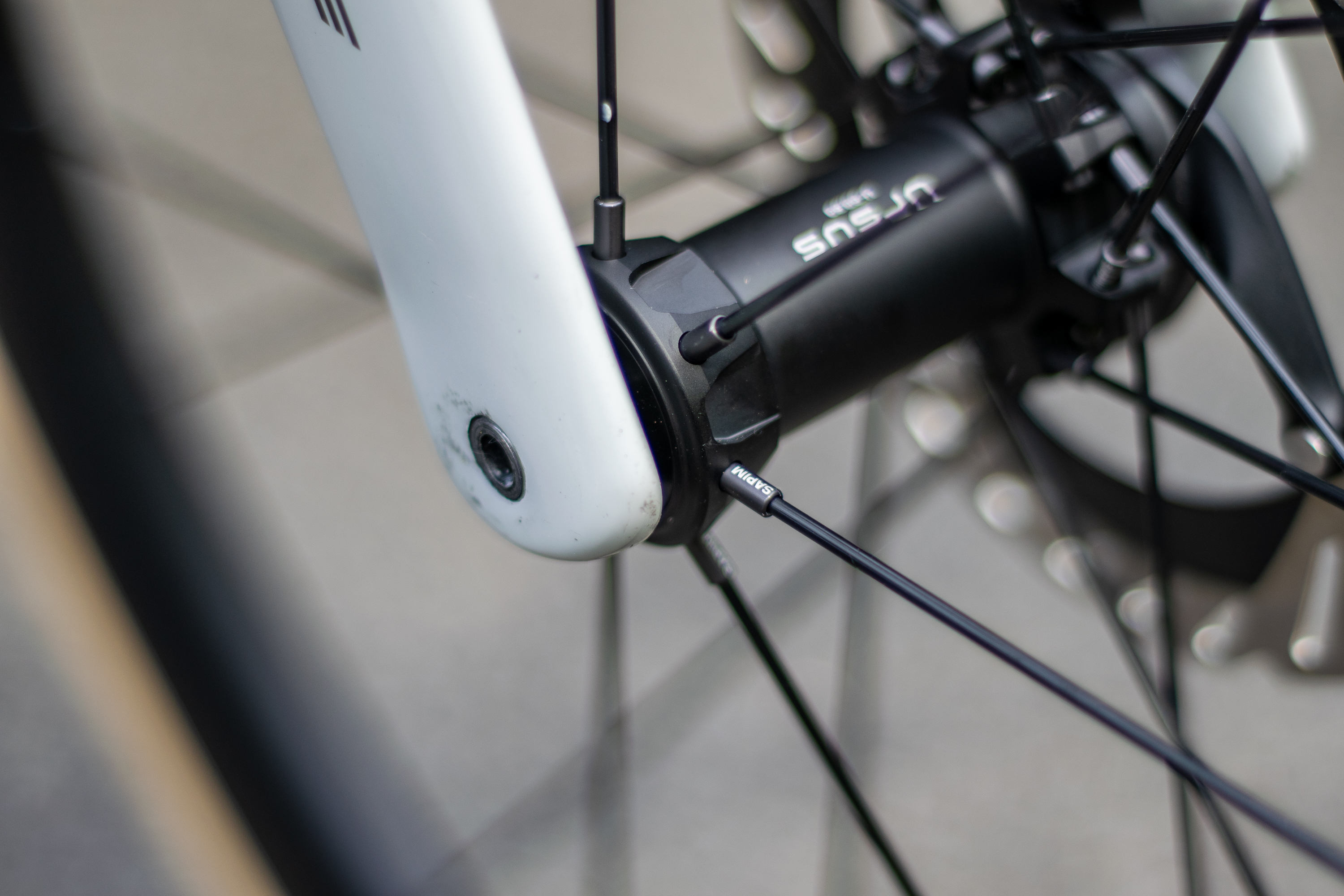 Here's a close-up of the new Sapim spokes; the stock Ursus Arya wheels use carbon Vonoa spokes.