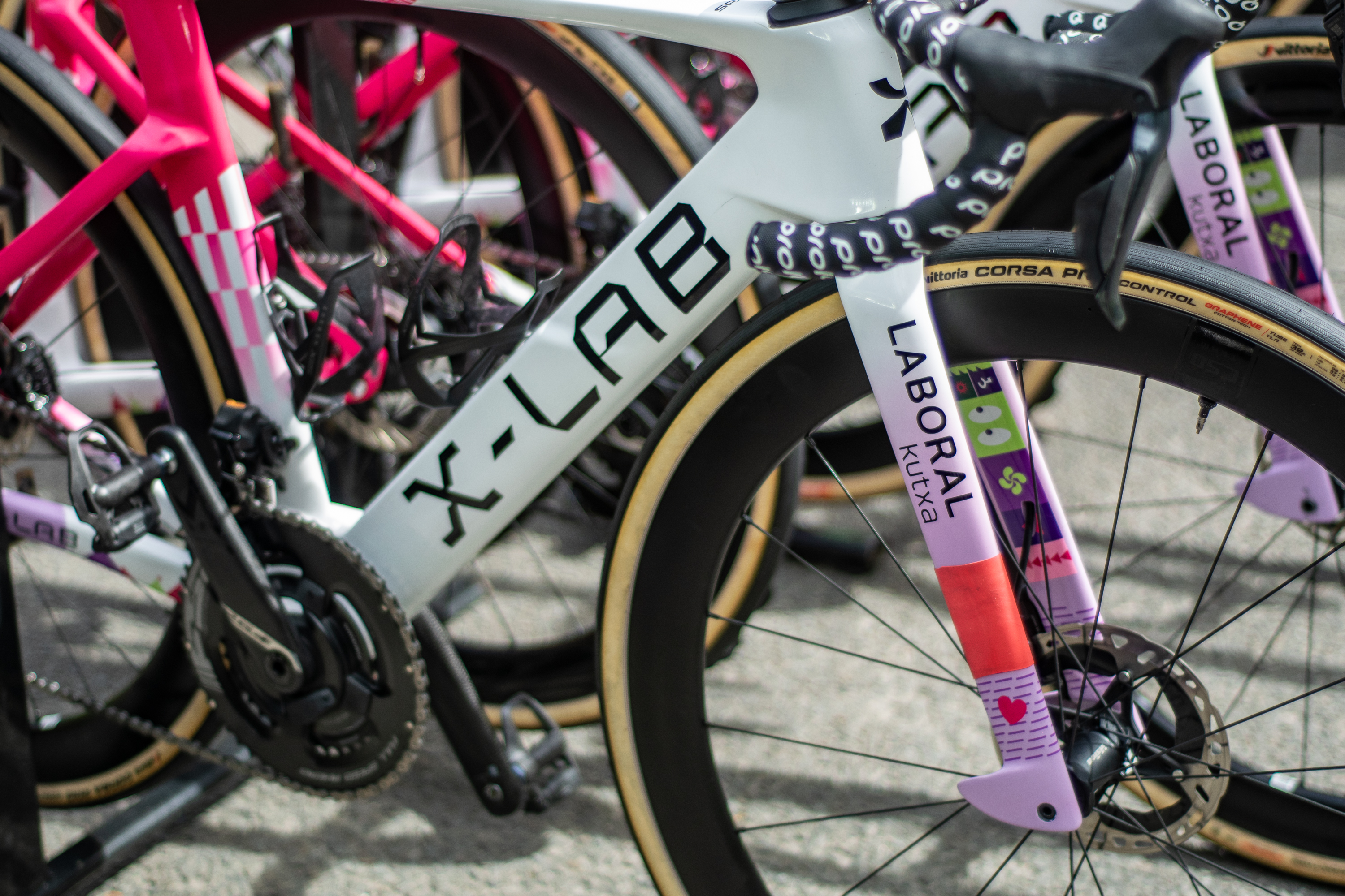 The Laboral Kutxa team ride X-Lab bikes. I was enjoying the bright pink and white paint jobs; they really pop.