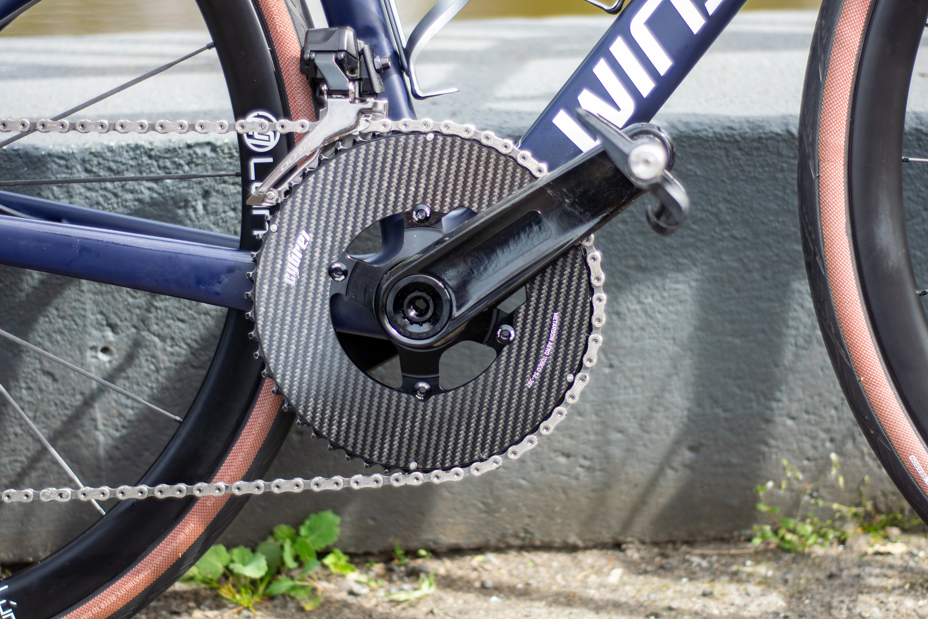 This crankset drew me in, a 54 tooth Cybrei carbon aero chainring, with some electrical tape over the crank arm brand, answer on a postcard...