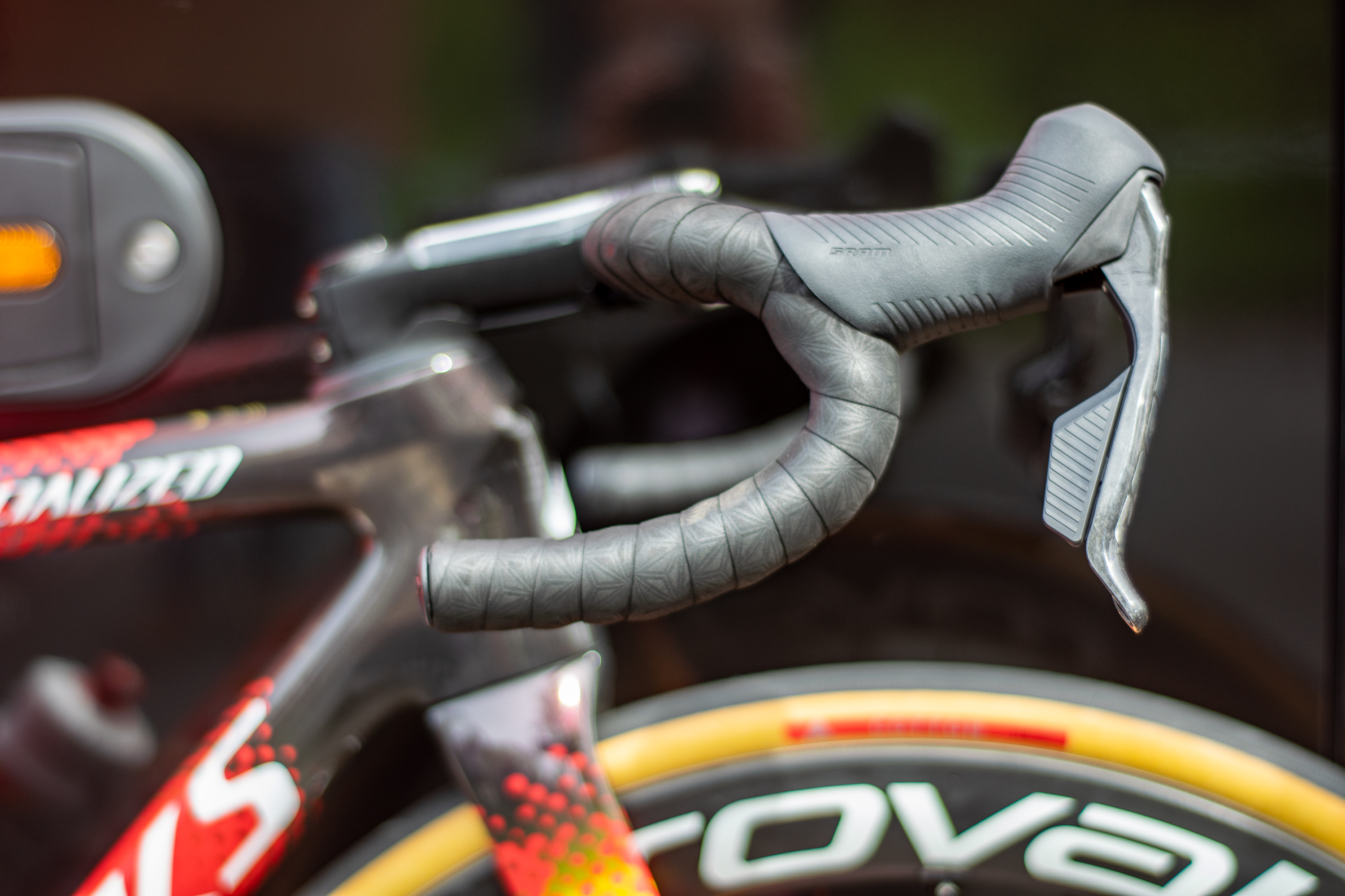 This was an interesting bar setup for Shrin Van Anrooij, a two-piece bar and step, full bar tape wrap and SRAM wireless shifters on the tops and drops. Very Roubaix specific.