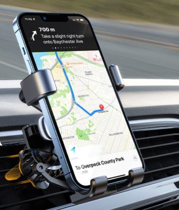 This phone holder for your car clips to your car’s vents and gives you a clear view of your GPS while you drive. It works universally with nearly any type of phone, and has feet on three sides to keep your phone secure no matter what terrain you’re driving over.